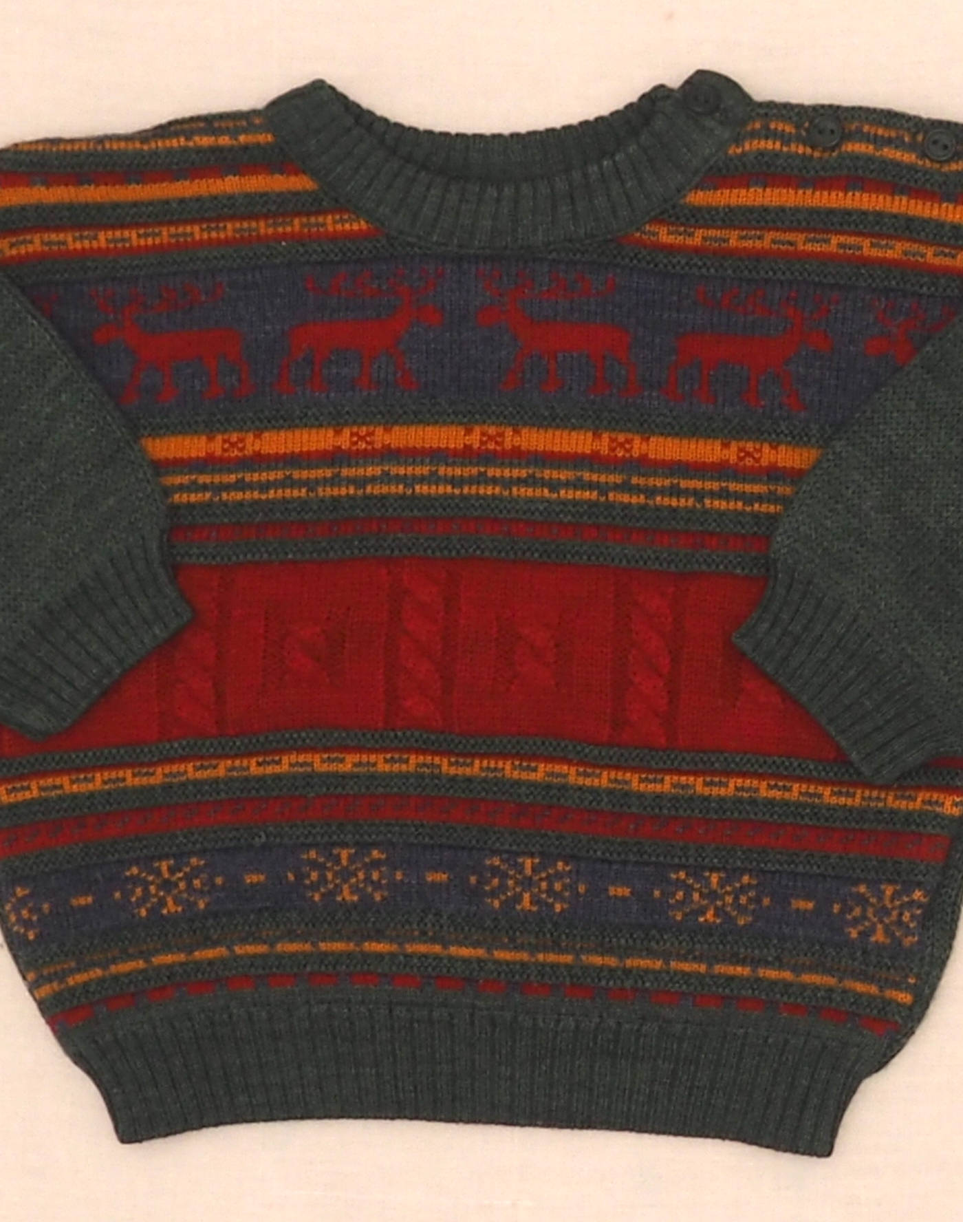 Pretty multicolored jacquard frieze sweater with winter motifs, closed at the shoulder with three buttons. Very good condition, acrylic knit.
