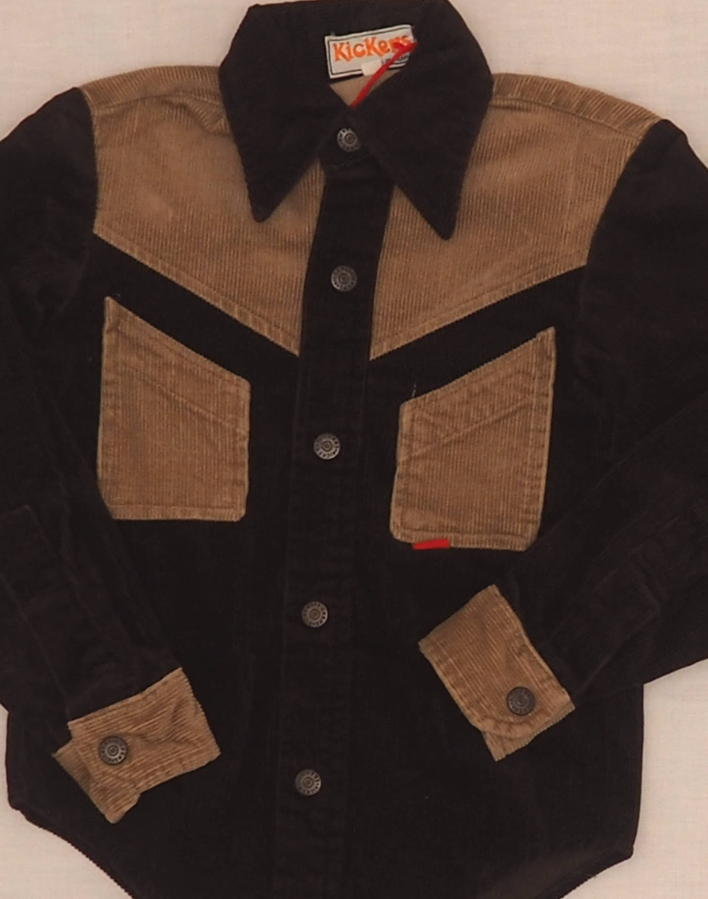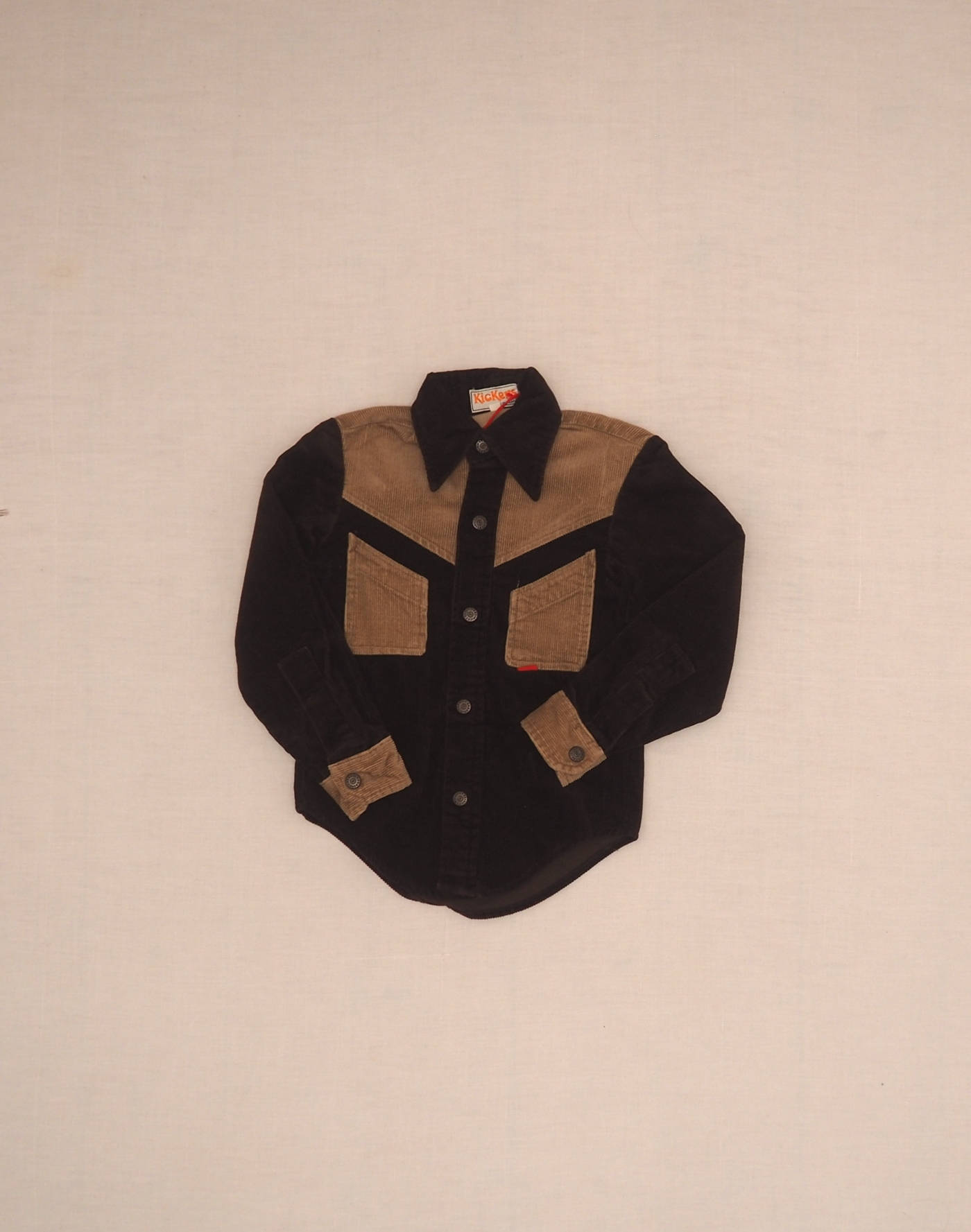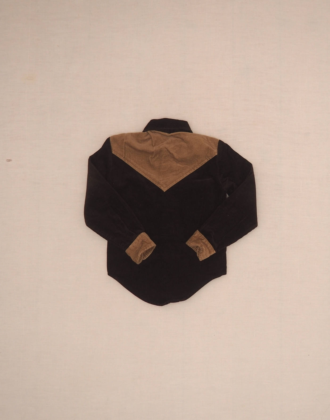 Attractive fitted shirt in brown corduroy with contrasting shoulder inserts and pockets. Long buttoned sleeves, fastened with five snap rivets. Indicated for 4-year-olds but very fitted, would be more suited to a three-year-old. Made in France, 100% cotton.