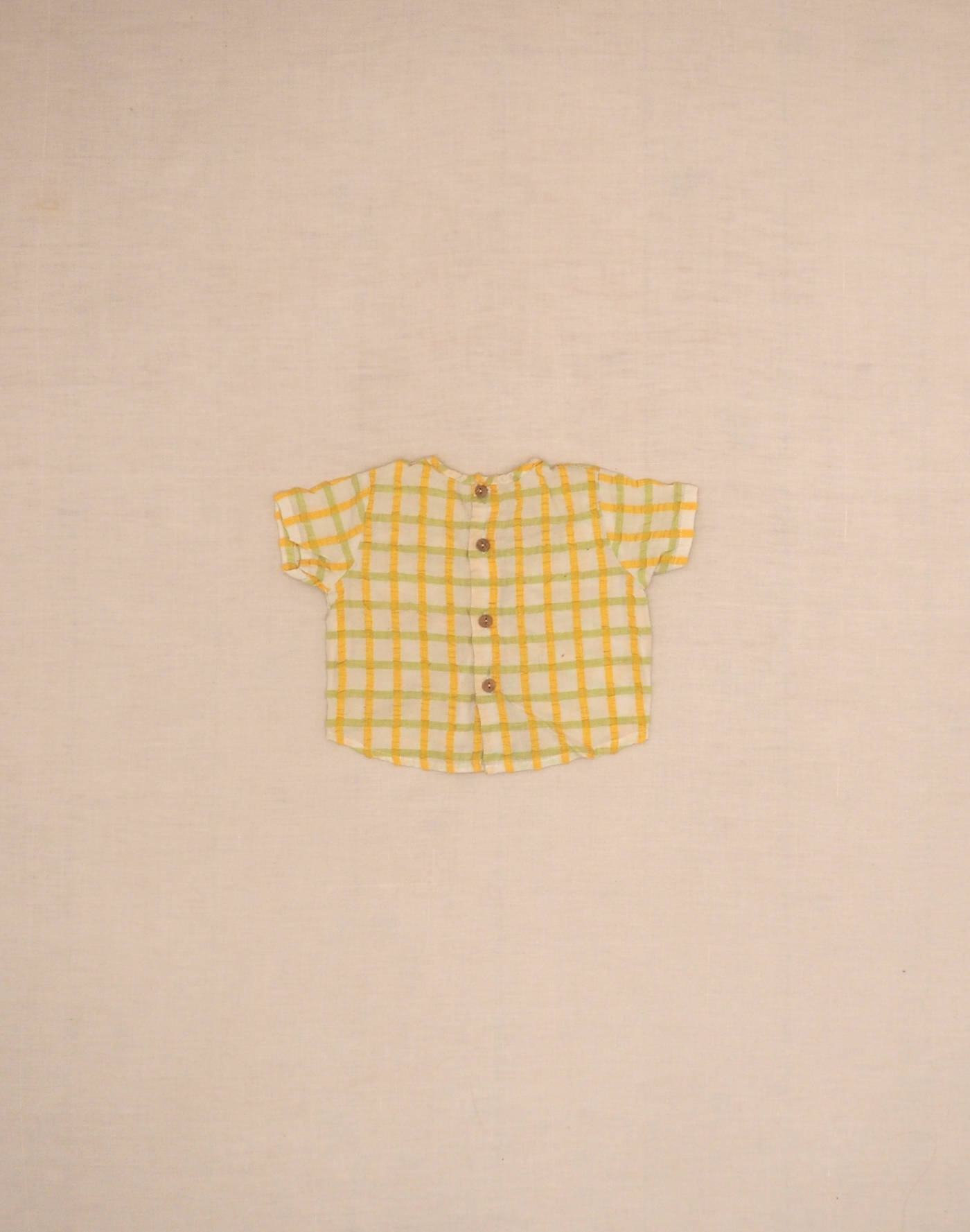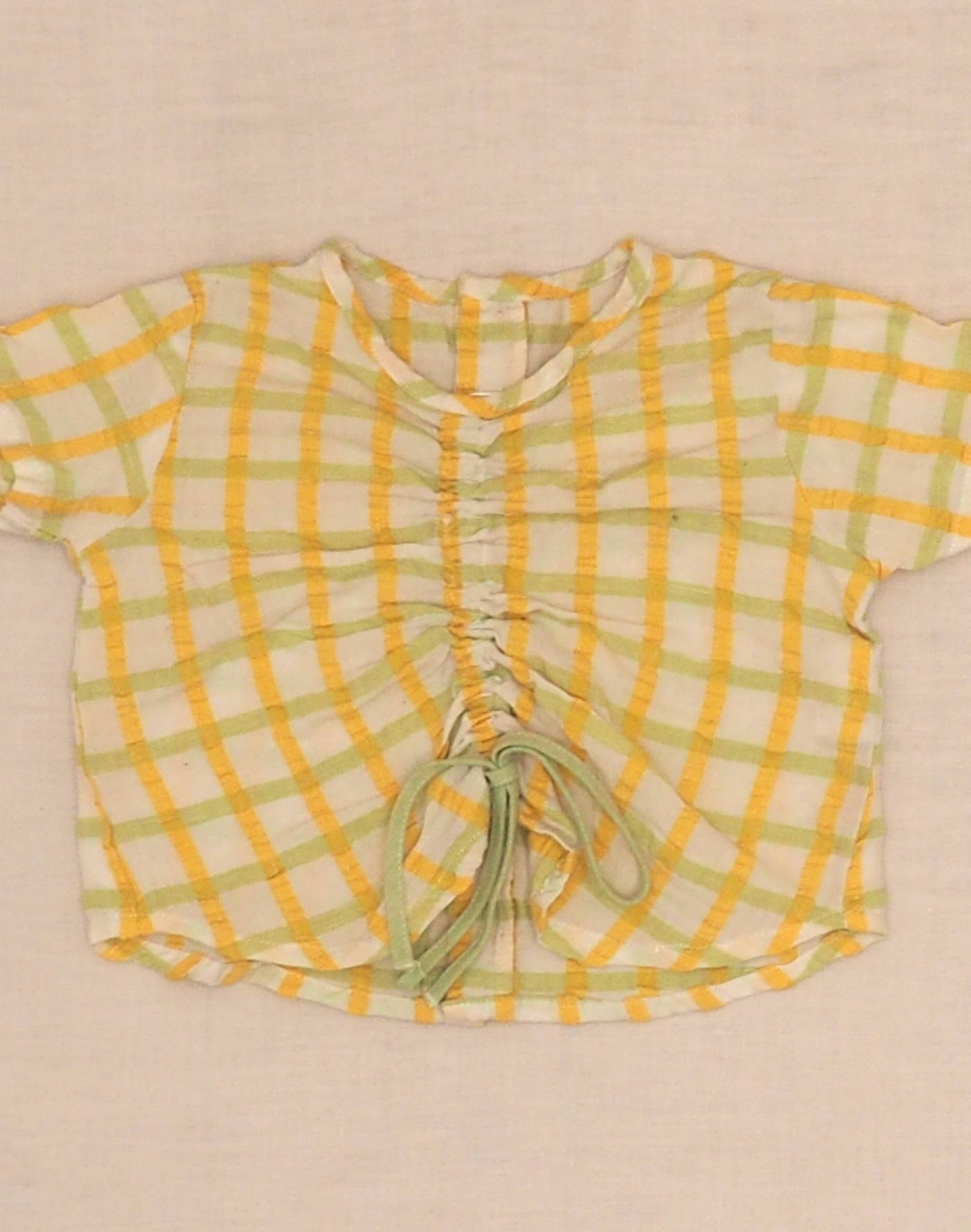 Cute plaid seersucker blouse, short sleeves, with gathers to tie at the bust. Closed with four buttons on the back. Made in France, very good condition, fabric 50% cotton, 50% polyester.