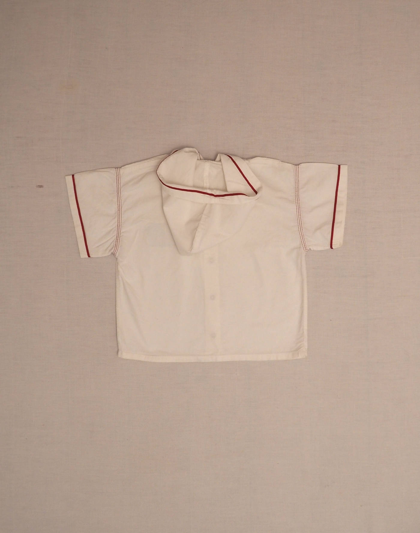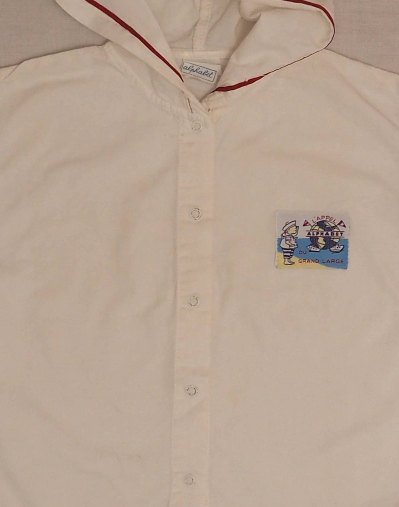 Cute white hooded shirt, contrasting red stitching and ribbon on sleeves, “L’appel du grand large” patch on bust. Closed with five snap buttons. Very good condition, 100% cotton.