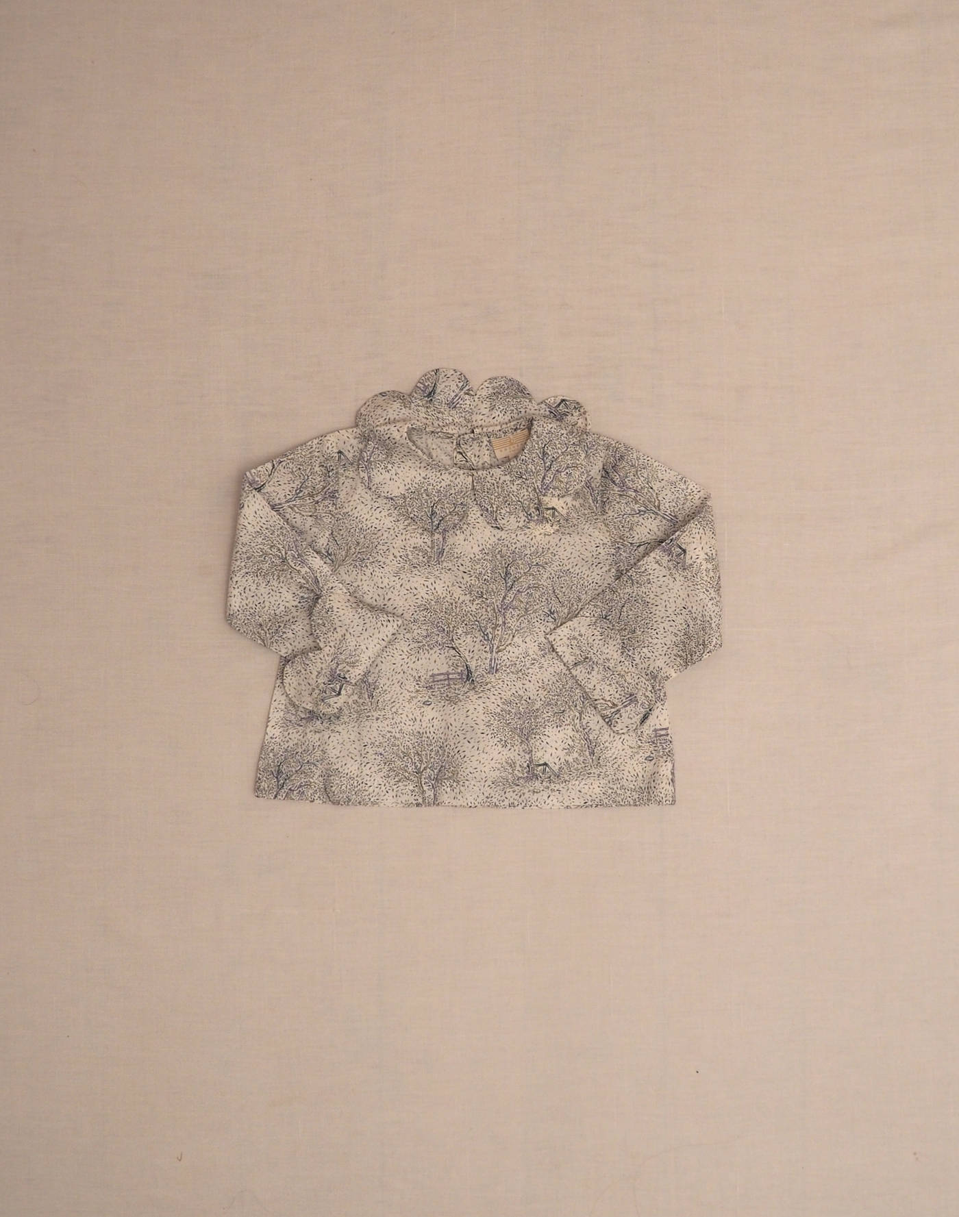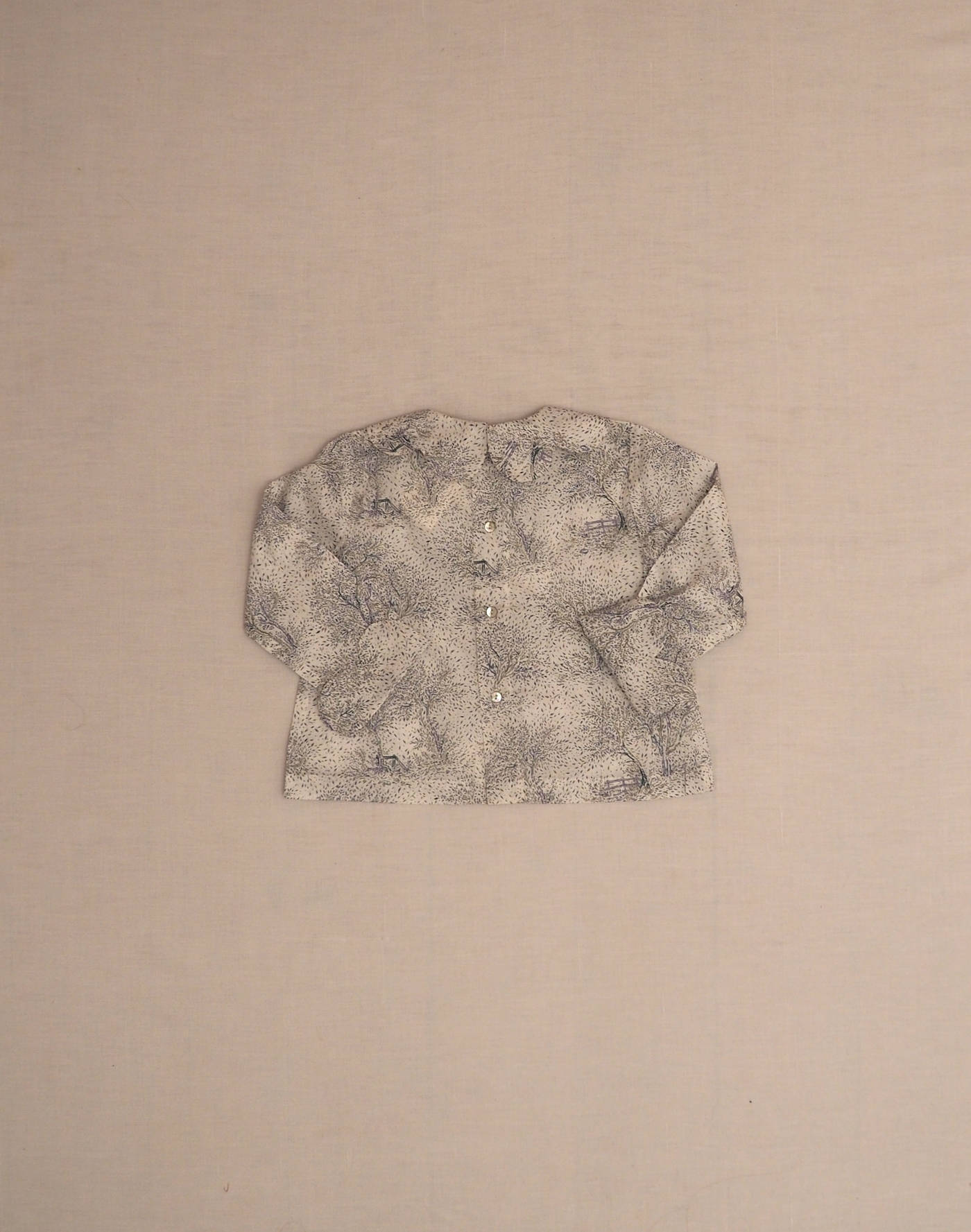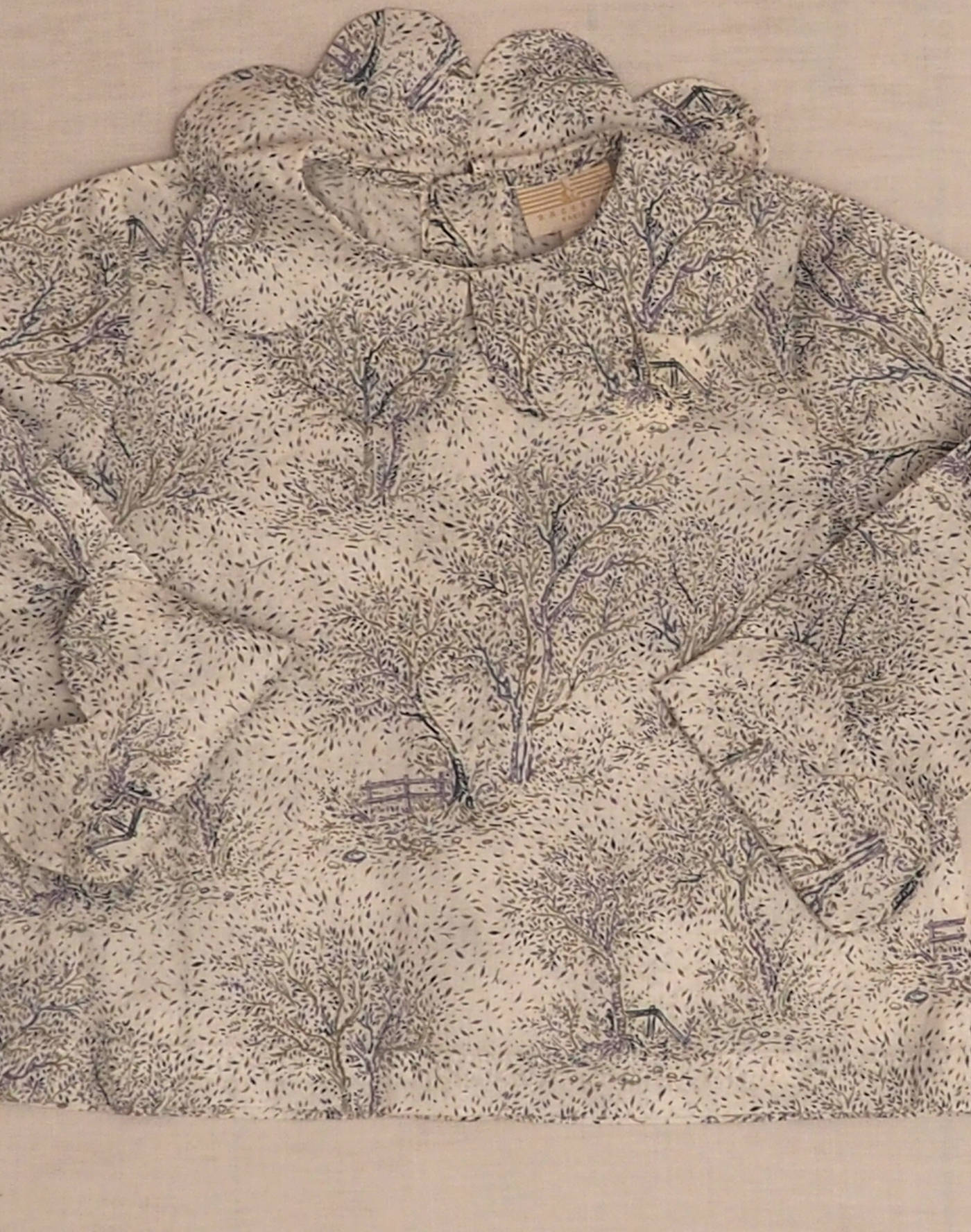 Baghère by Sylvie Loussier, from an exceptional new stock of the children’s couture brand. Charming long-sleeved blouse in Liberty tree motif, with gorgeous petal collar, petal-finish lapel on sleeves, closed in the back with four real mother-of-pearl buttons. Made in France, mint condition, 100% cotton.