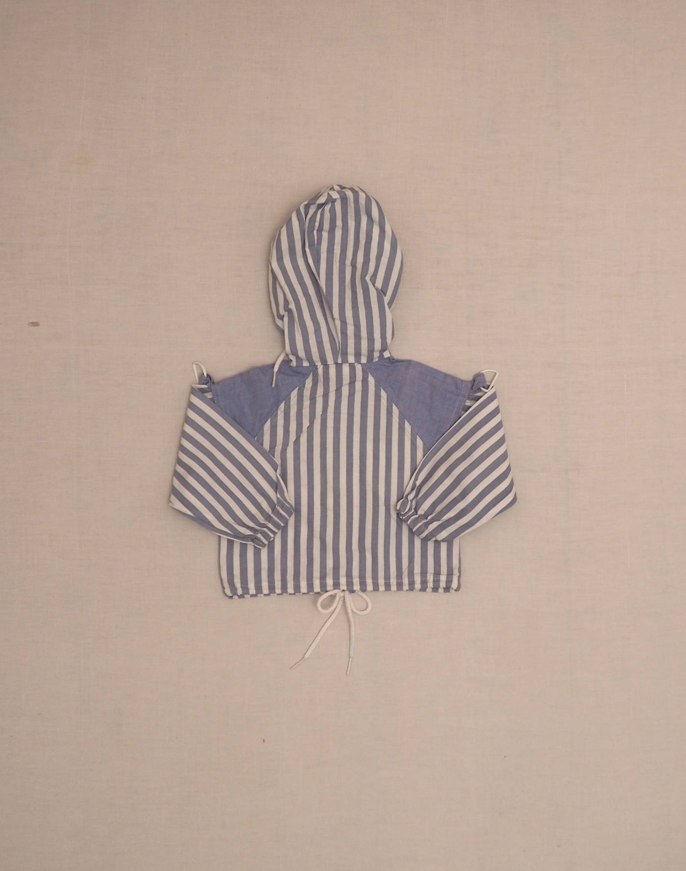 Attractive hooded jacket in very light striped cotton, embroidered crest on chest, chambray inserts on shoulders, drawstring hood and waist, elasticated cuffs, front zip fastening. Very good condition, 100% cotton.