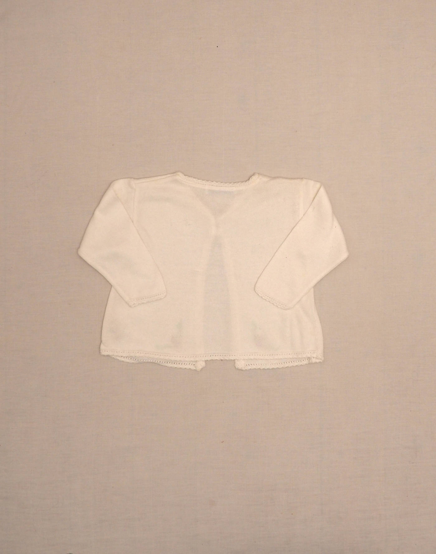 Very pretty cardigan in light white knit, with pretty lace finish on the edges, cherry embroidery on the waist, closed with two buttons on the collar. Made in France, very good condition, fabric 51% cotton, 49% acrylic.