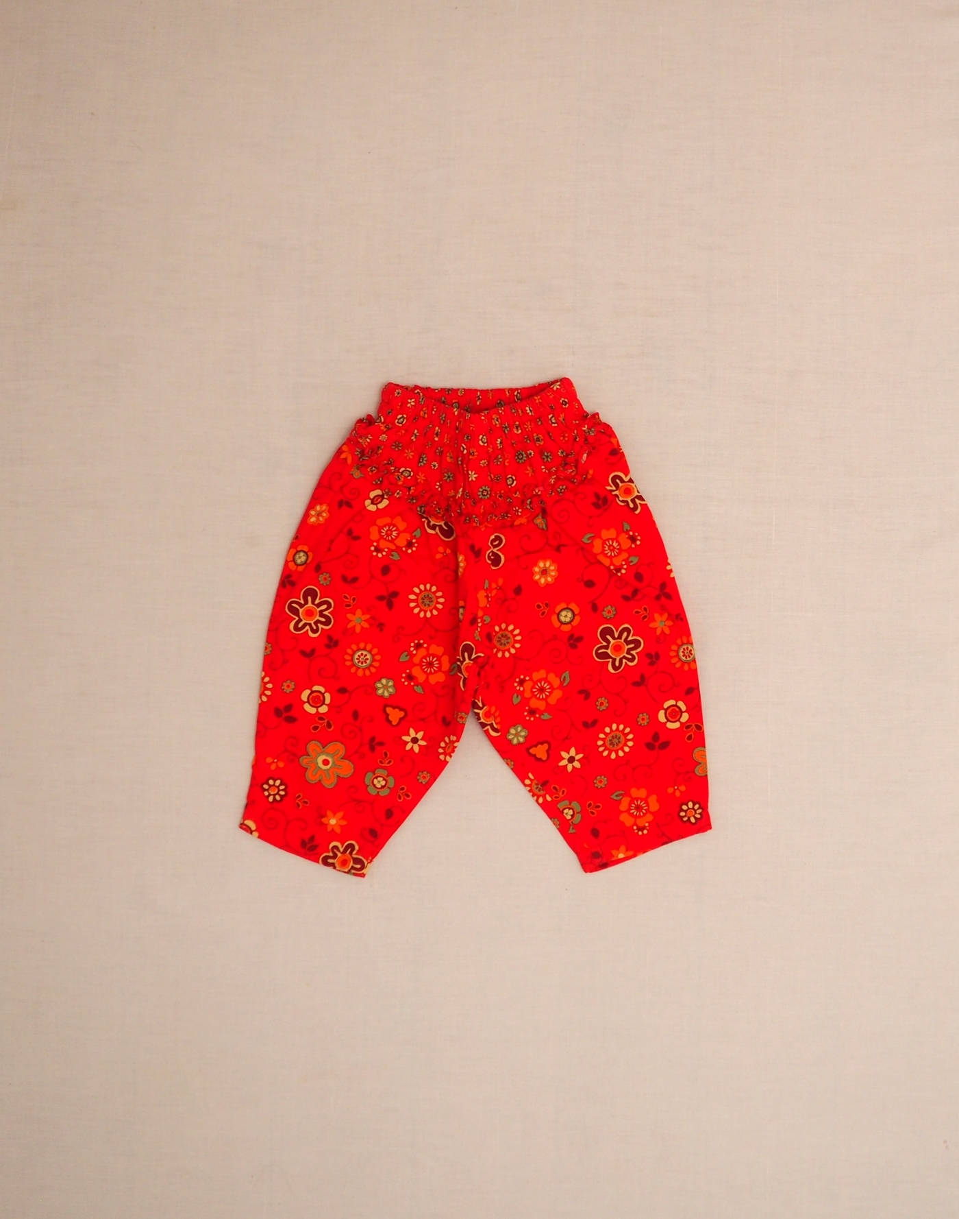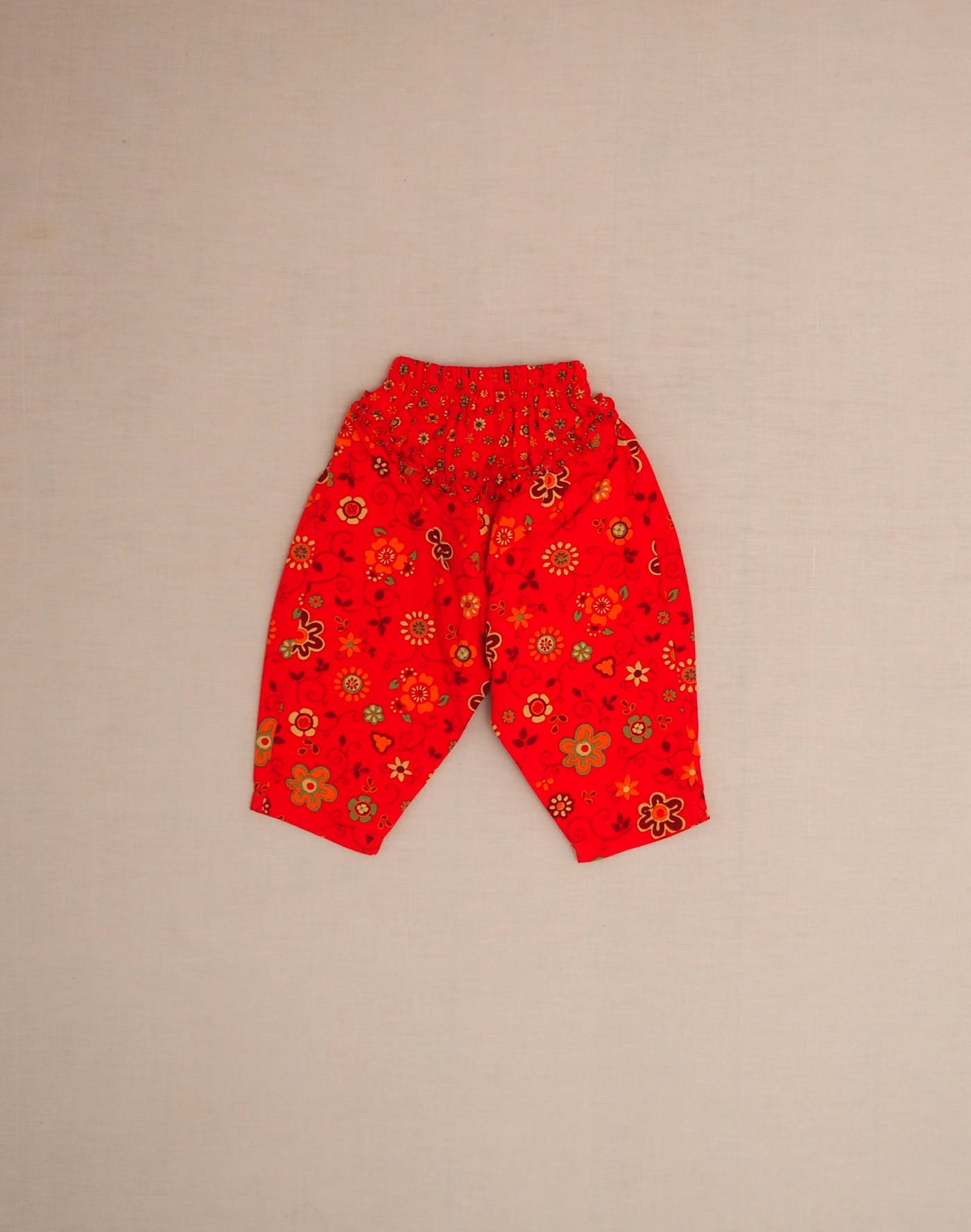 Delightful floral red cotton pants, fully lined, contrasting fabric at waist with frilly band, elastic waistband. Very good condition, 100% cotton.
