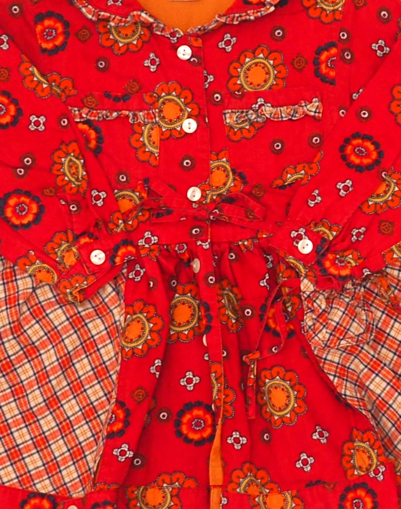 Beautiful red dress with floral motif, fully lined in orange cotton, long buttoned sleeves, contrasting plaid pockets and ruffles on collar, two patch pockets on chest, pleated waist. A strap to tie at the waist, and a small purse sewn onto a pocket. Beautiful stitching details. Front closure with seven pearly buttons. Very good condition, 100% cotton.
