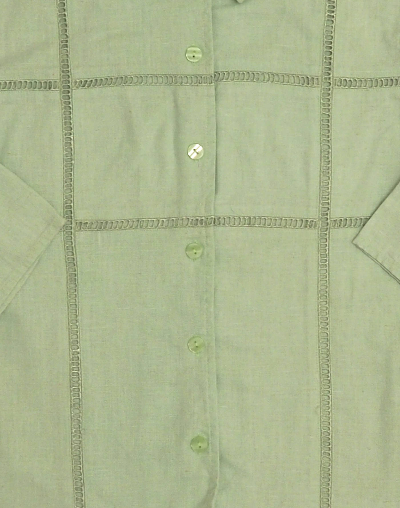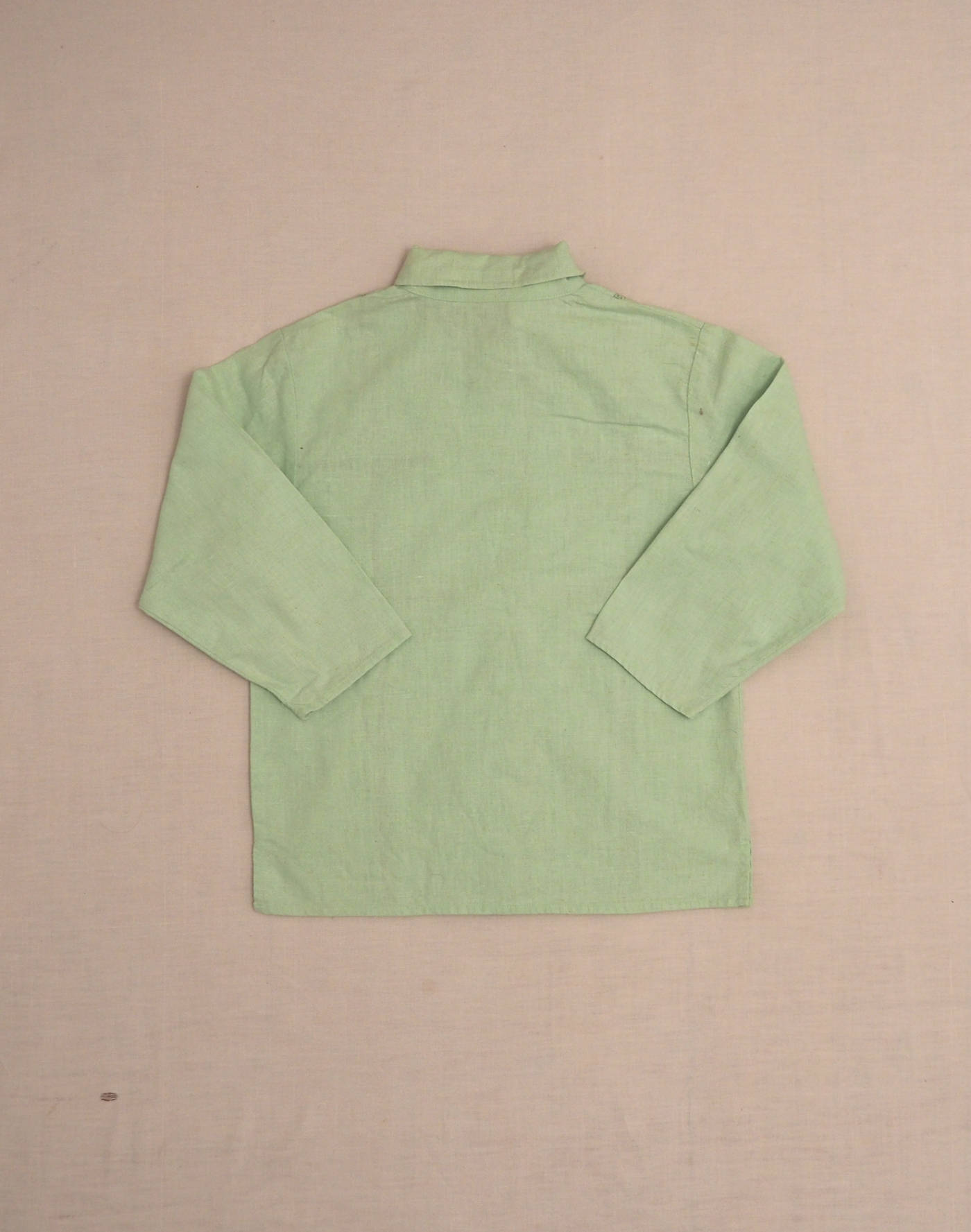 Size 6 years. Beautiful water-green shirt with openwork friezes criss-crossing the bust, fastened with five pearly buttons. Very good condition, fabric 55% linen, 45% cotton.