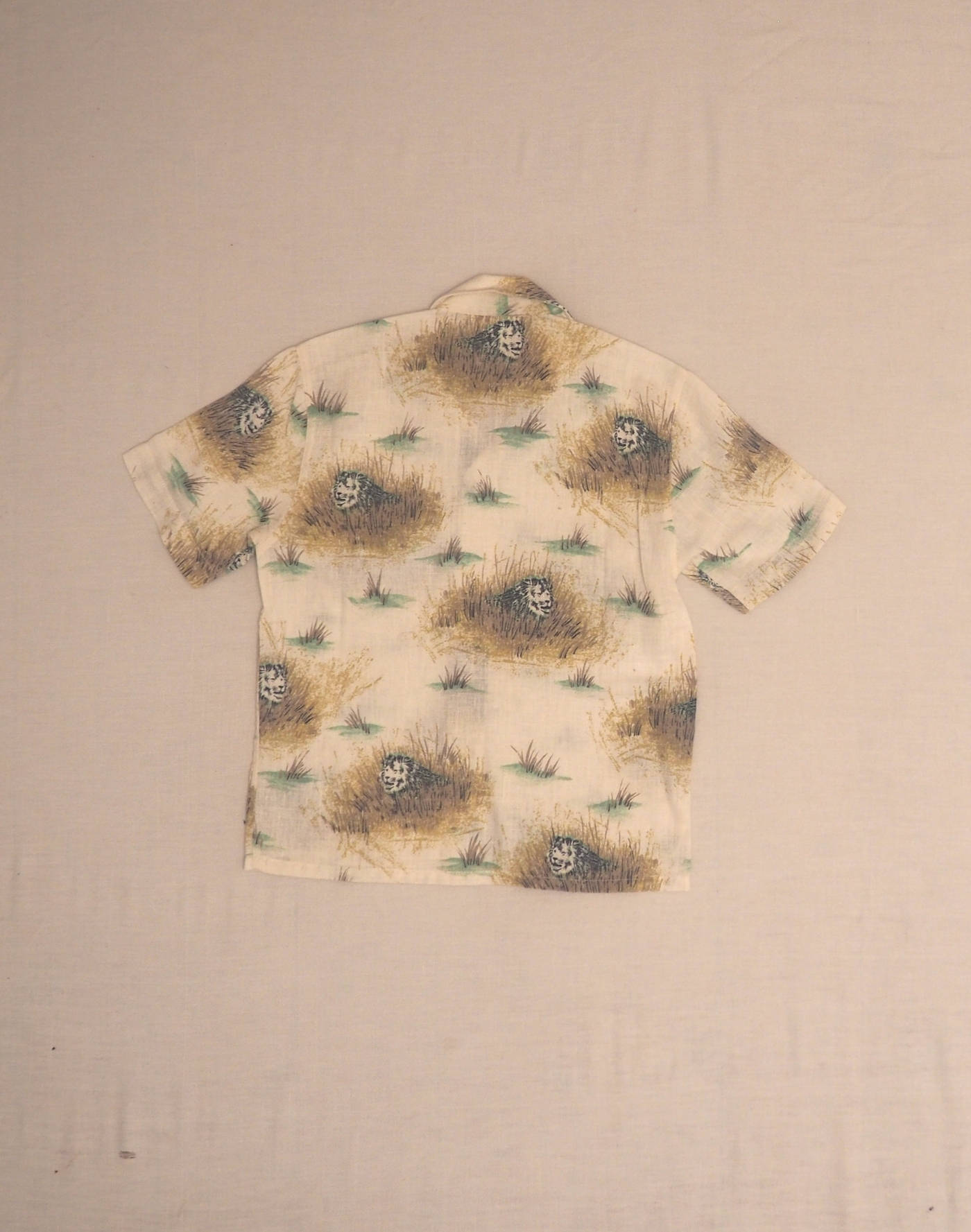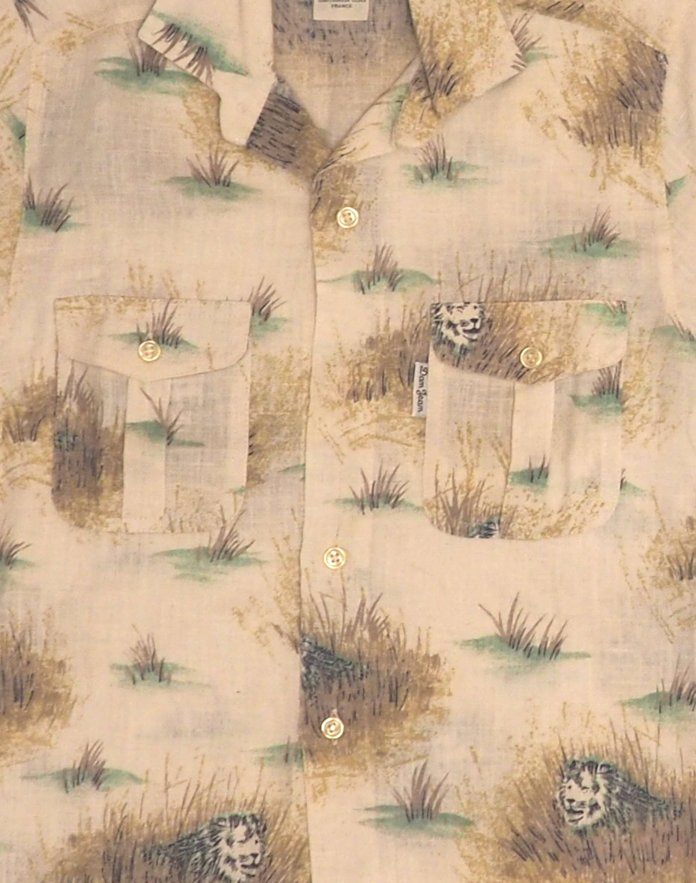 Size 6 years. Elegant lion-print blouse, two buttoned pockets on the bust, closed with four buttons. Made in France, fabric 65% polyester, 35% cotton.