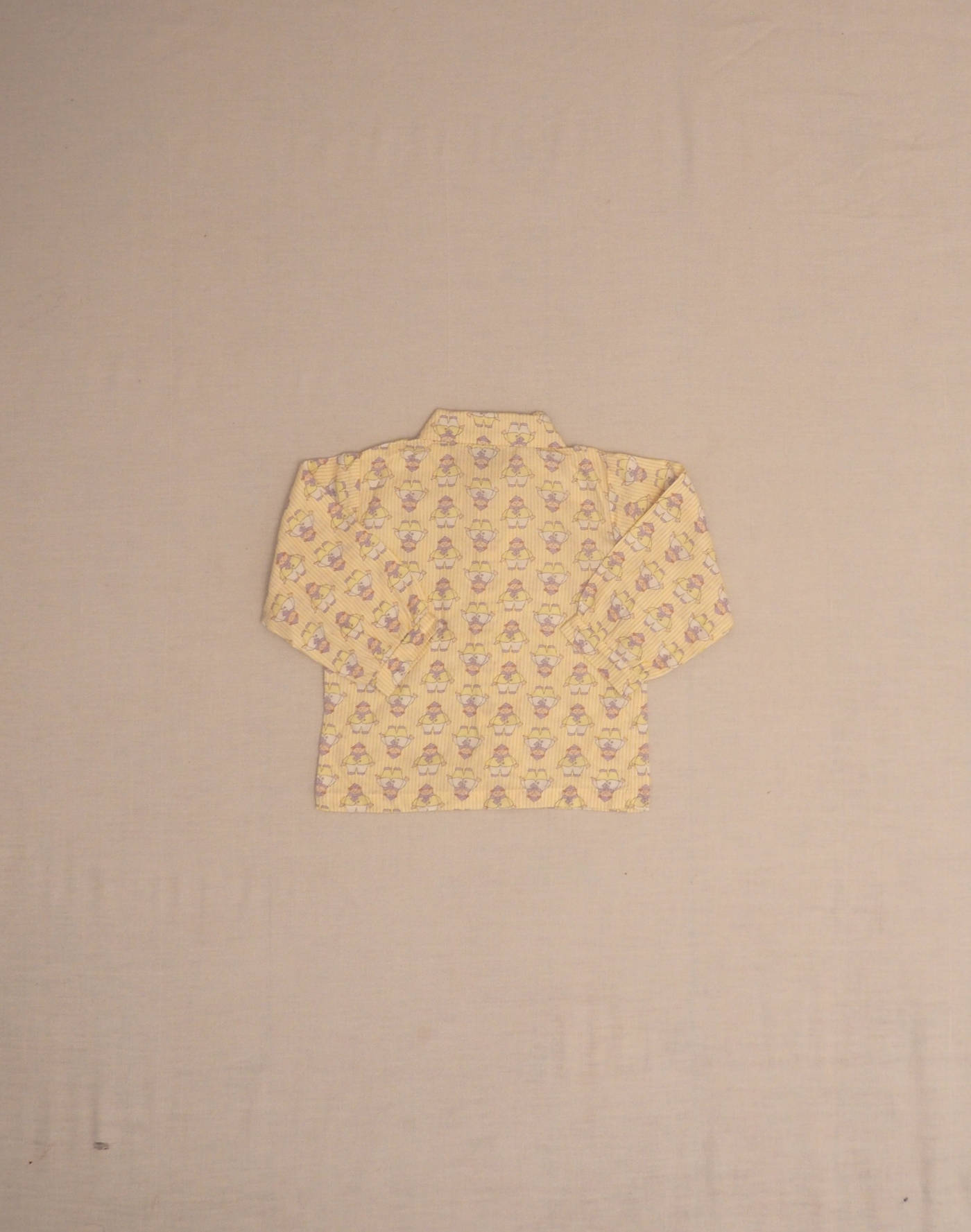 Fine yellow striped shirt with bonshomme motif, closed with four buttons. Made in France, very good condition, fabric 51% cotton, 49% modal.