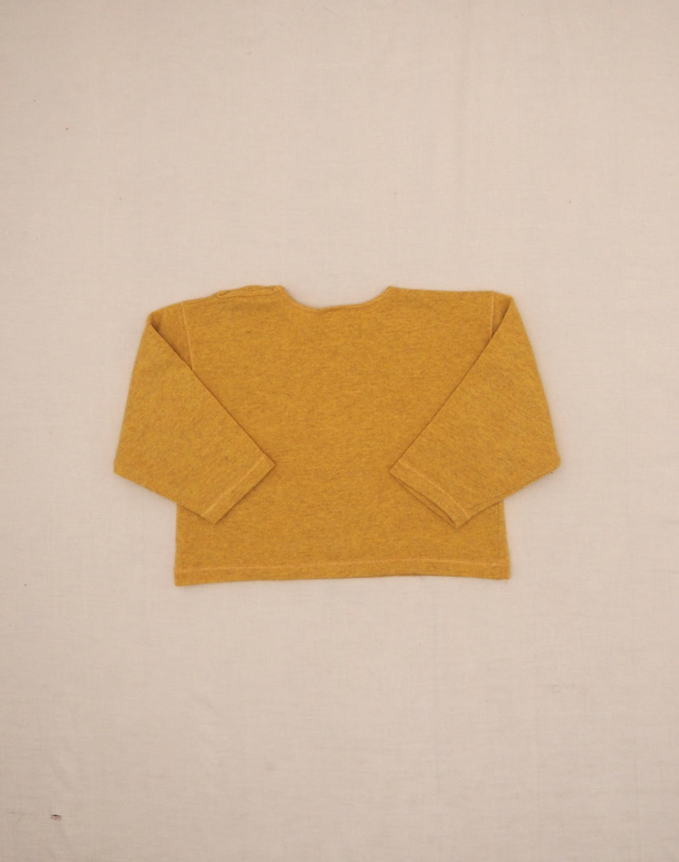 Lovely sweatshirt in soft mustard-colored chinée knit, embroidered with small flowers on the waist, closed with two buttons on the shoulder. Very good condition, knit 80% wool, 20% polyamide.
