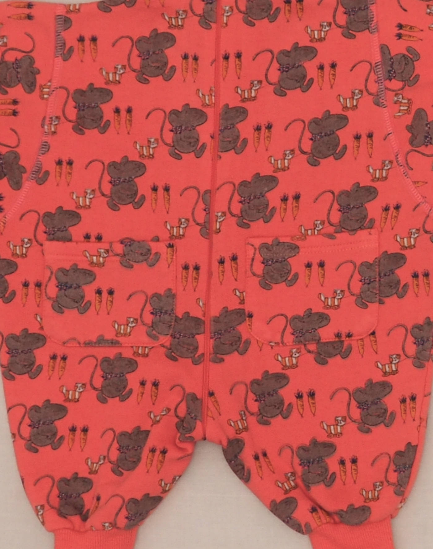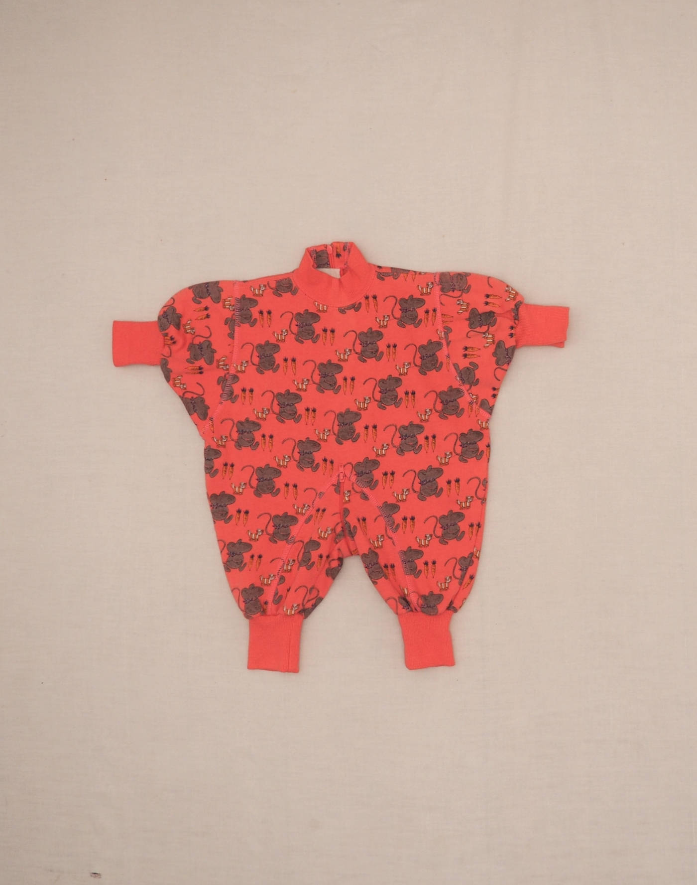 1970s. Beautiful jumpsuit or pajamas in pink jersey with mouse print and cat on wheels, ribbed cuffs and ankles, two front patch pockets. Zipper closure. Very good condition, no composition label but cotton feel.