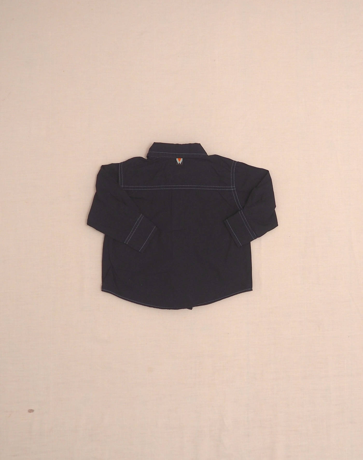 Elegant navy blue shirt with light blue contrast stitching, ruffles on the buttonhole, long buttoned sleeves, closed with five buttons. Very good condition, 100% cotton, made in the USA.