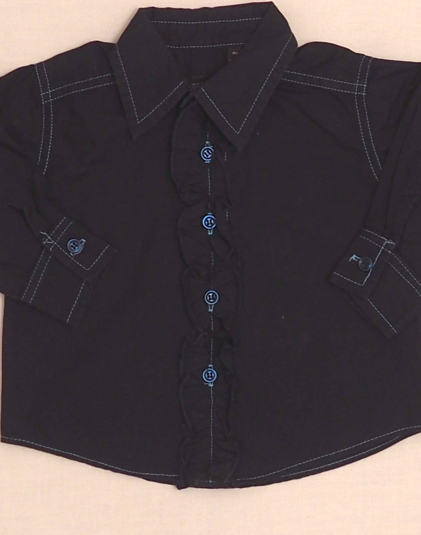 Elegant navy blue shirt with light blue contrast stitching, ruffles on the buttonhole, long buttoned sleeves, closed with five buttons. Very good condition, 100% cotton, made in the USA.