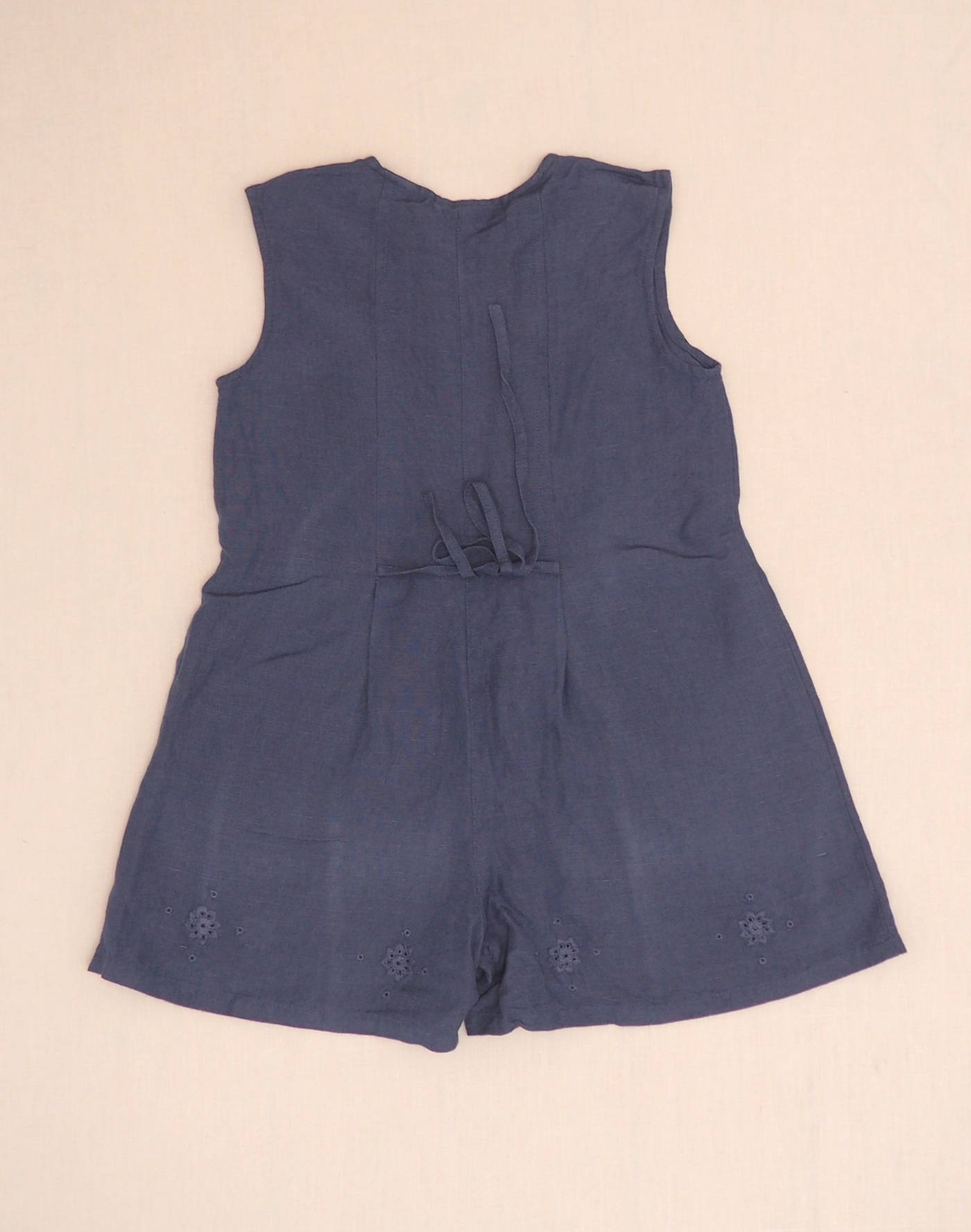 Beautiful navy blue linen & viscose sleeveless summer jumpsuit, openwork embroidery on lower leg, five-button front closure, tie straps at front and back. Very good condition, fabric 55% linen, 45% viscose.