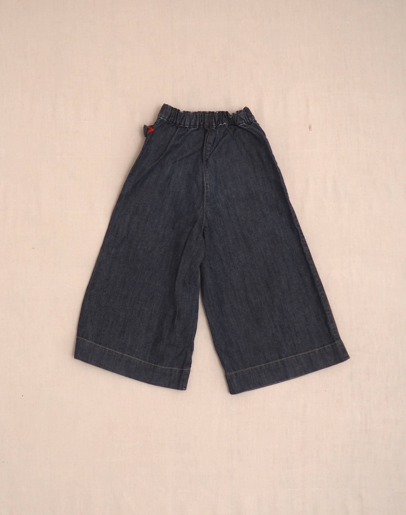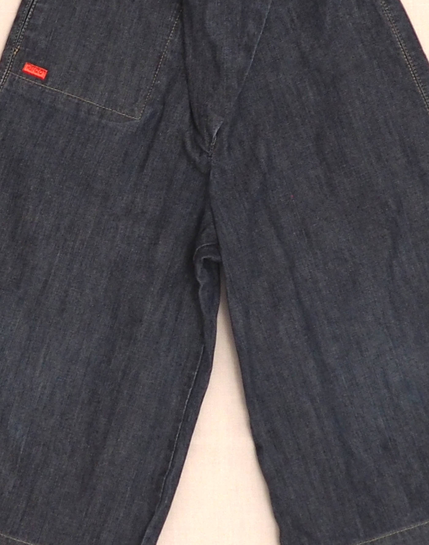 Lovely Kenzo pants in blue denim with extra-wide four/fifths legs, elasticated waistband and zip fastening, snap button fastening at hip attached by velcro. Made in France, very good condition, 100% cotton.