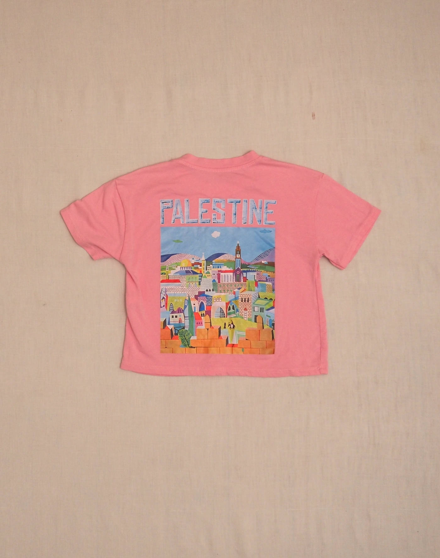 Beautiful pink T-shirt with Palestine print, small on the front, large on the back. Made in Italy, very good condition, 95% cotton, 5% elastane.