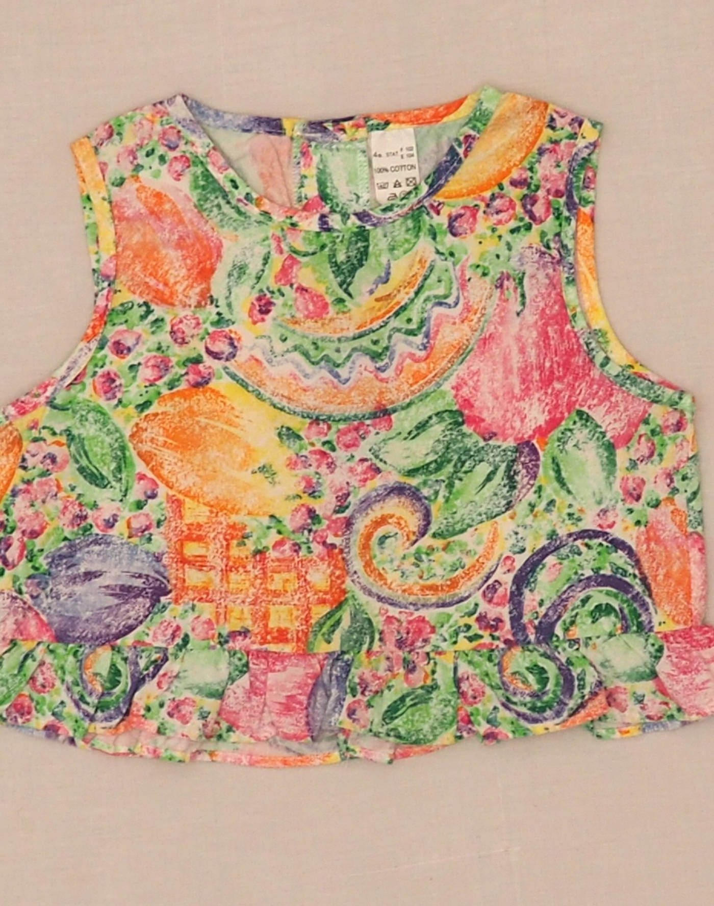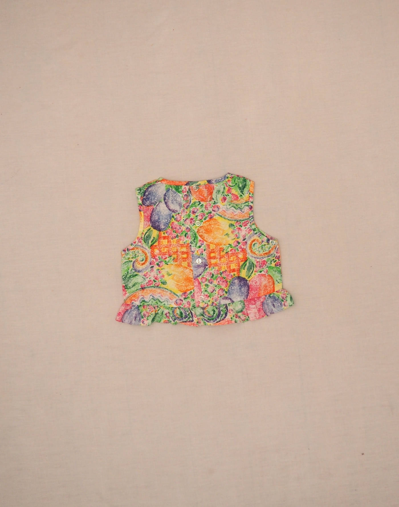 Charming short, light sleeveless blouse with pastel pattern, flounce at waist, four-button closure at back. Very good condition, 100% cotton.