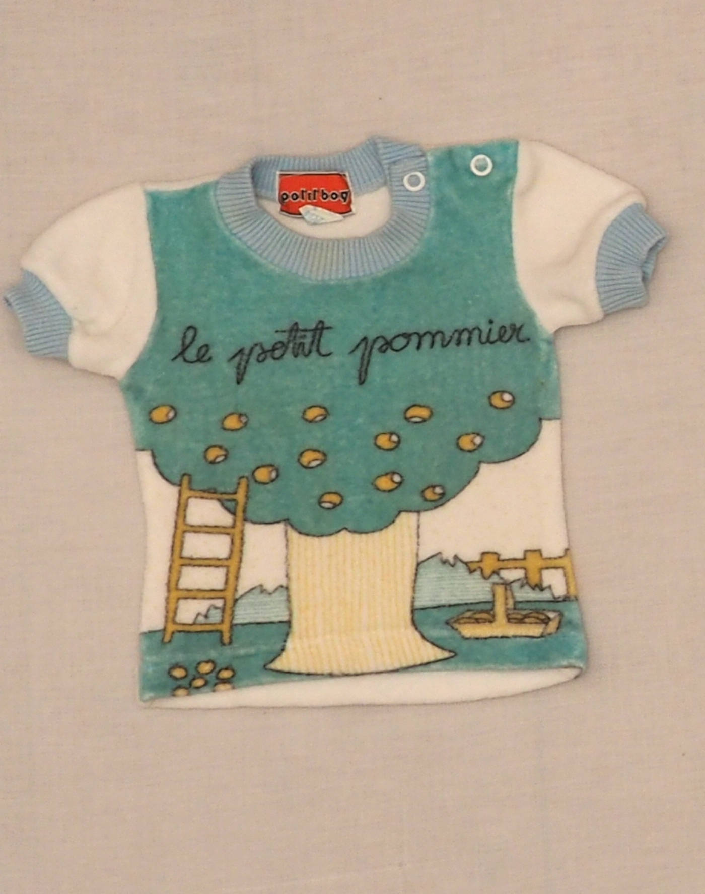 Lovely 1970s velvet T-shirt, short sleeves, small apple tree print on bust. Closed at the shoulder with two press studs. Very good condition, fabric 68% cotton, 32% modal and nylon, made in Spain.