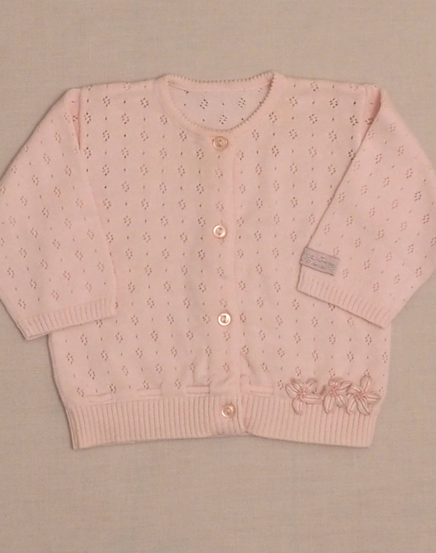 Lovely pale pink cardigan in openwork knit, with three small flowers appliquéd on the waist, fastened with four buttons. Very good condition, 100% cotton.