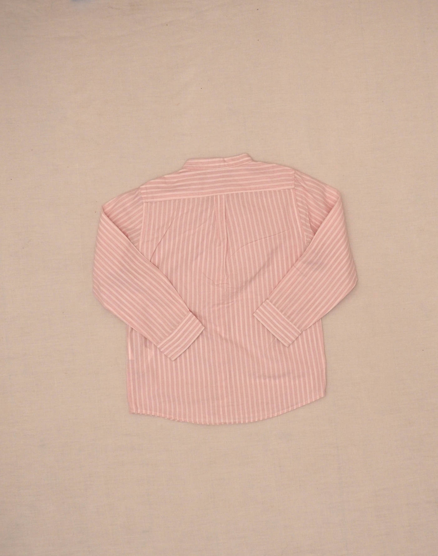 Pretty shirt with fine white and pink stripes, long buttoned sleeves, Mao collar, embroidered logo on chest, fastened with five buttons. Very good condition, 100% cotton.