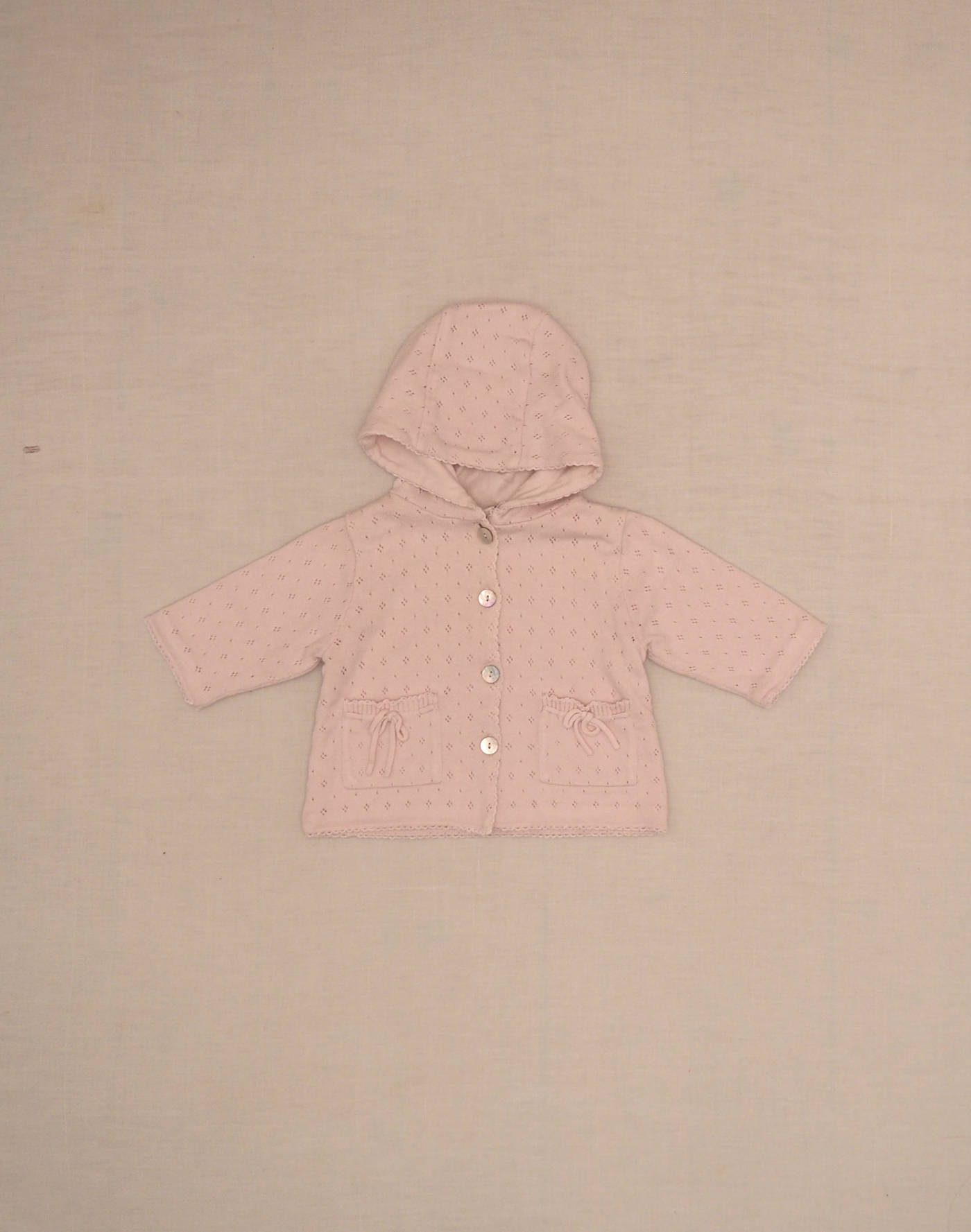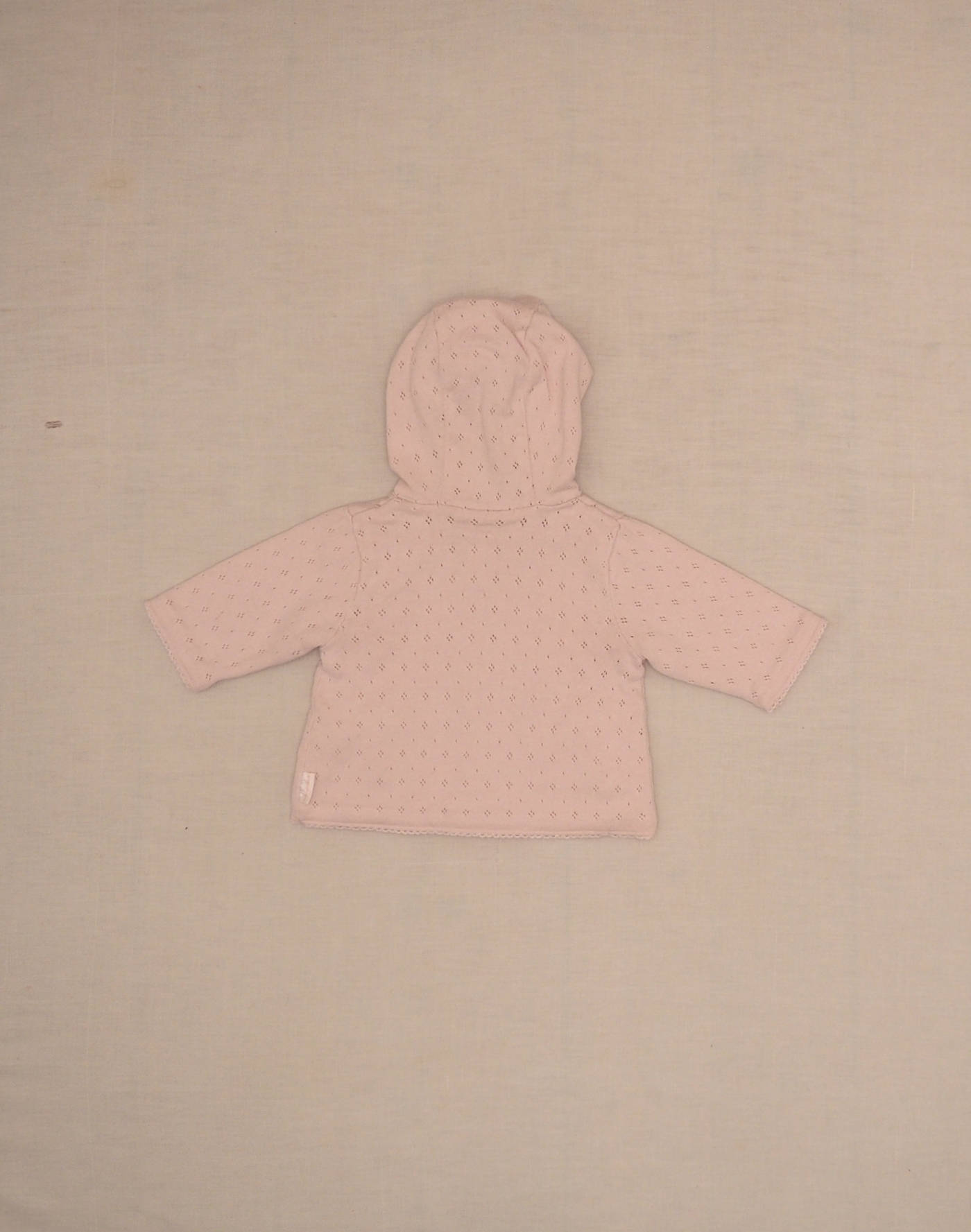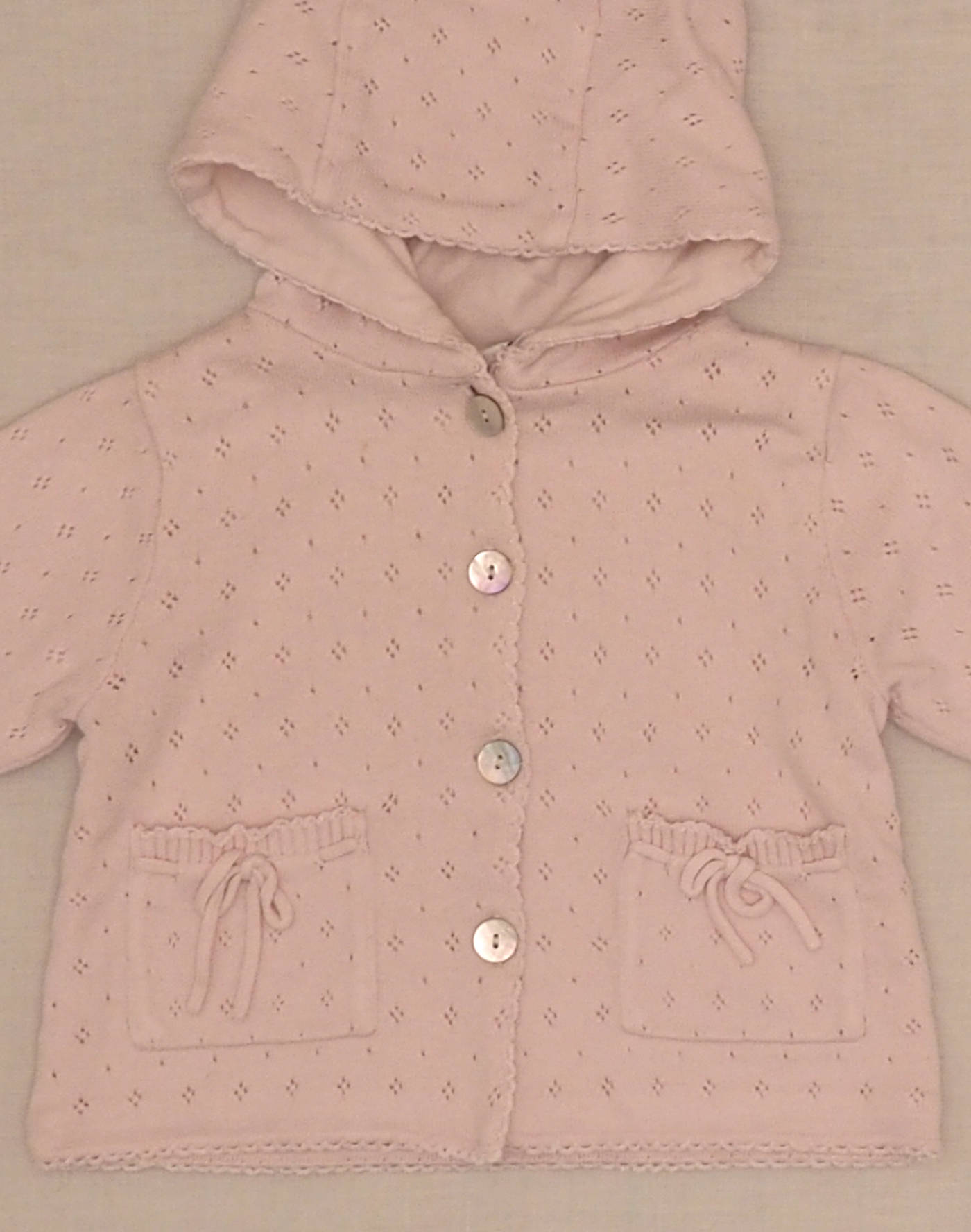 Lovely hooded cardigan fully lined in pale pink knit with pointelle effect, two patch pockets with little bows in front, fastened with four real mother-of-pearl buttons. Very good condition, 100% cotton.