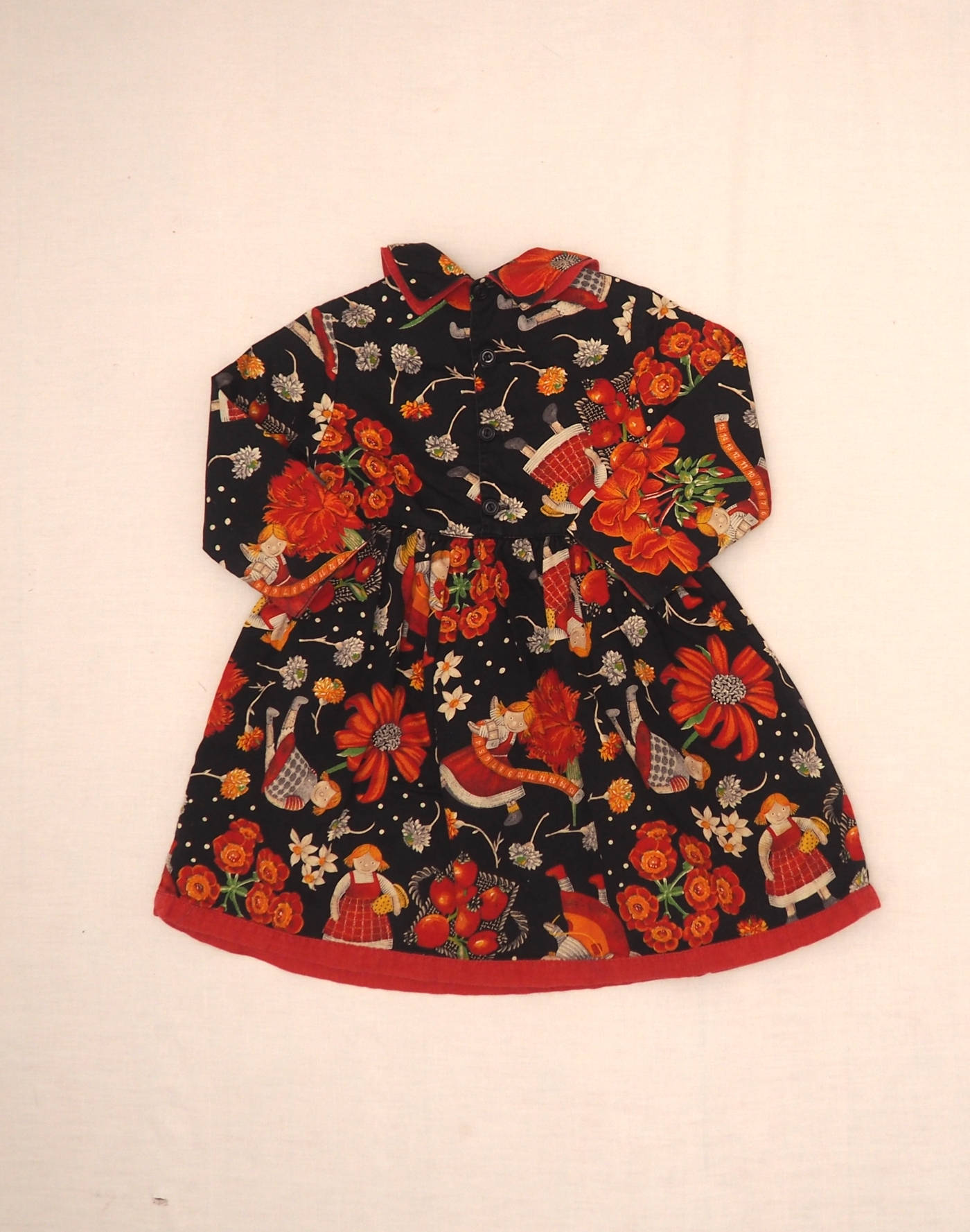 Vintage Catimini. Beautiful lined winter dress with doll & poppy motifs, long sleeves, pleated waist, double collar in red linen, closed in the back with four buttons. Very good condition, 100% cotton.