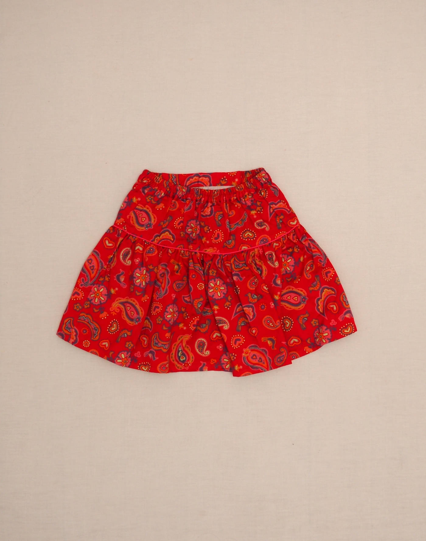 Pretty red skirt in impais cotton with paisley & bird print, pleated with mid-level piping, elastic waistband. Very good condition, 100% cotton.