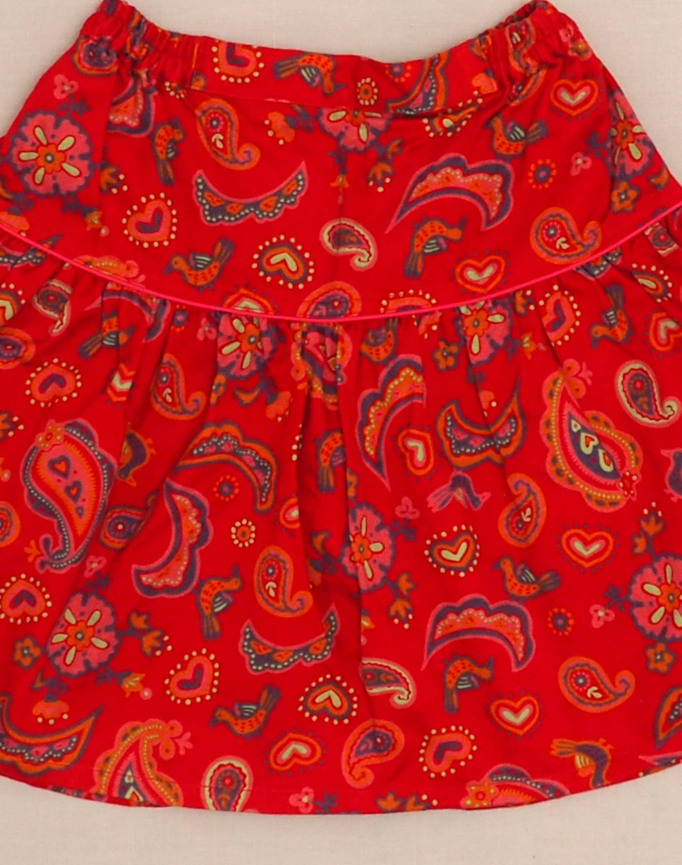 Pretty red skirt in impais cotton with paisley & bird print, pleated with mid-level piping, elastic waistband. Very good condition, 100% cotton.