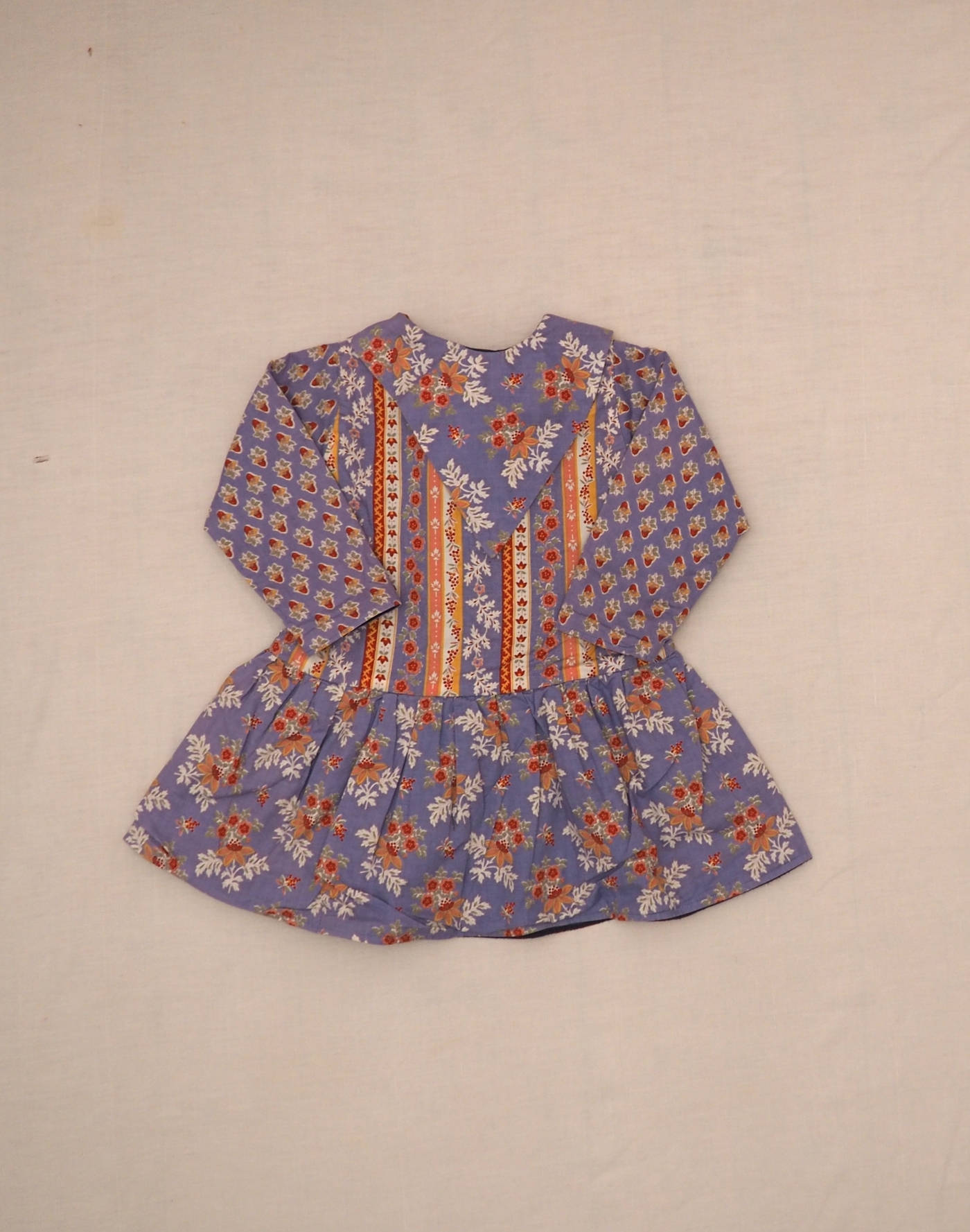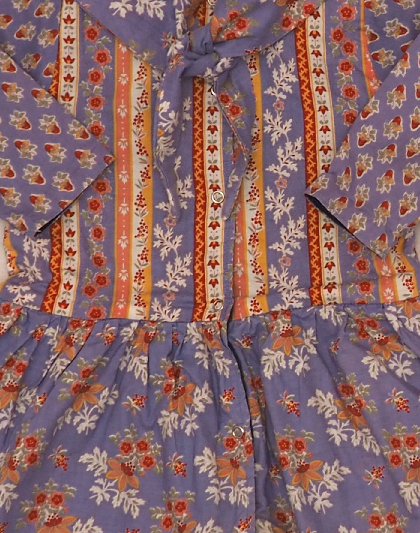 Charming lined winter dress with Provencal motif, pretty scarf collar to tie, pleated waist. Fully lined in navy blue jersey. Closed with five snap buttons. Made in France, very good condition, no composition label but cotton feel.
