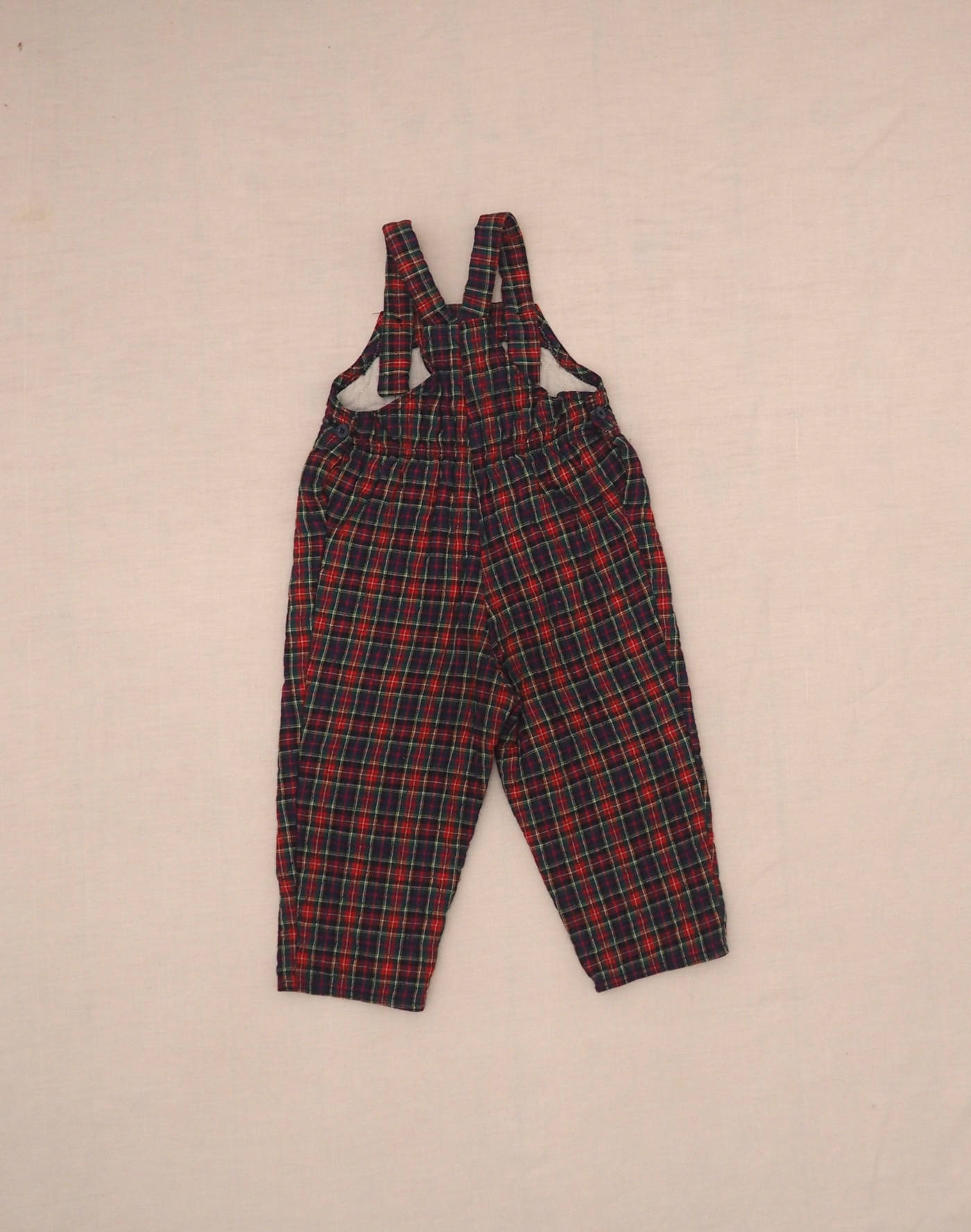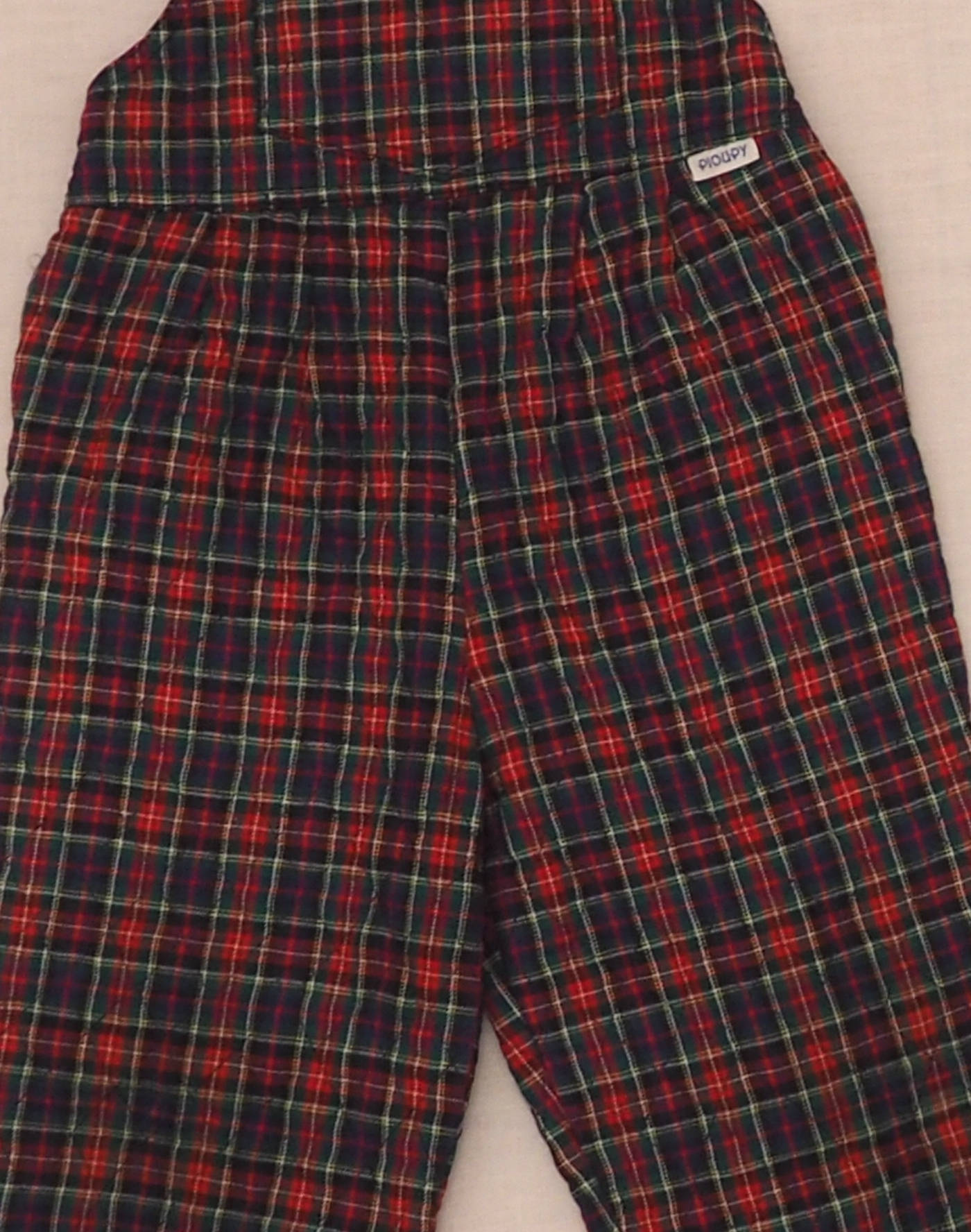 Cute dungarees in quilted tartan, one chest pocket, straps fastened at front with two buttons, elastic at back. Made in France, very good condition, fabric 50% cotton, 50% polyester.