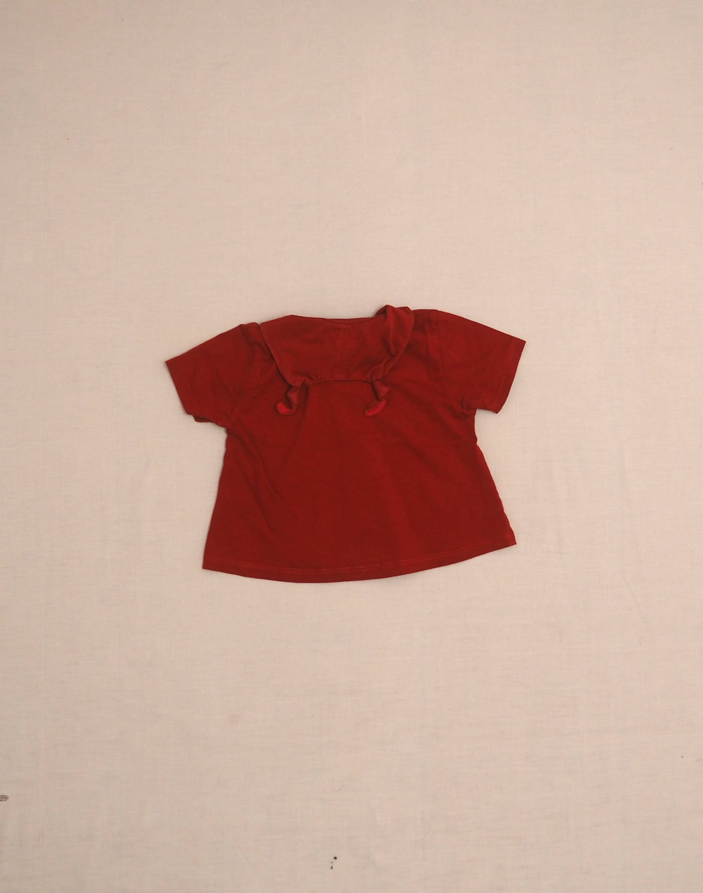 Adorable blouse in soft red jersey with bunny appliqué on the bust and sailor collar with little bows on the back. Closed with four buttons. Very good condition, 100% cotton.