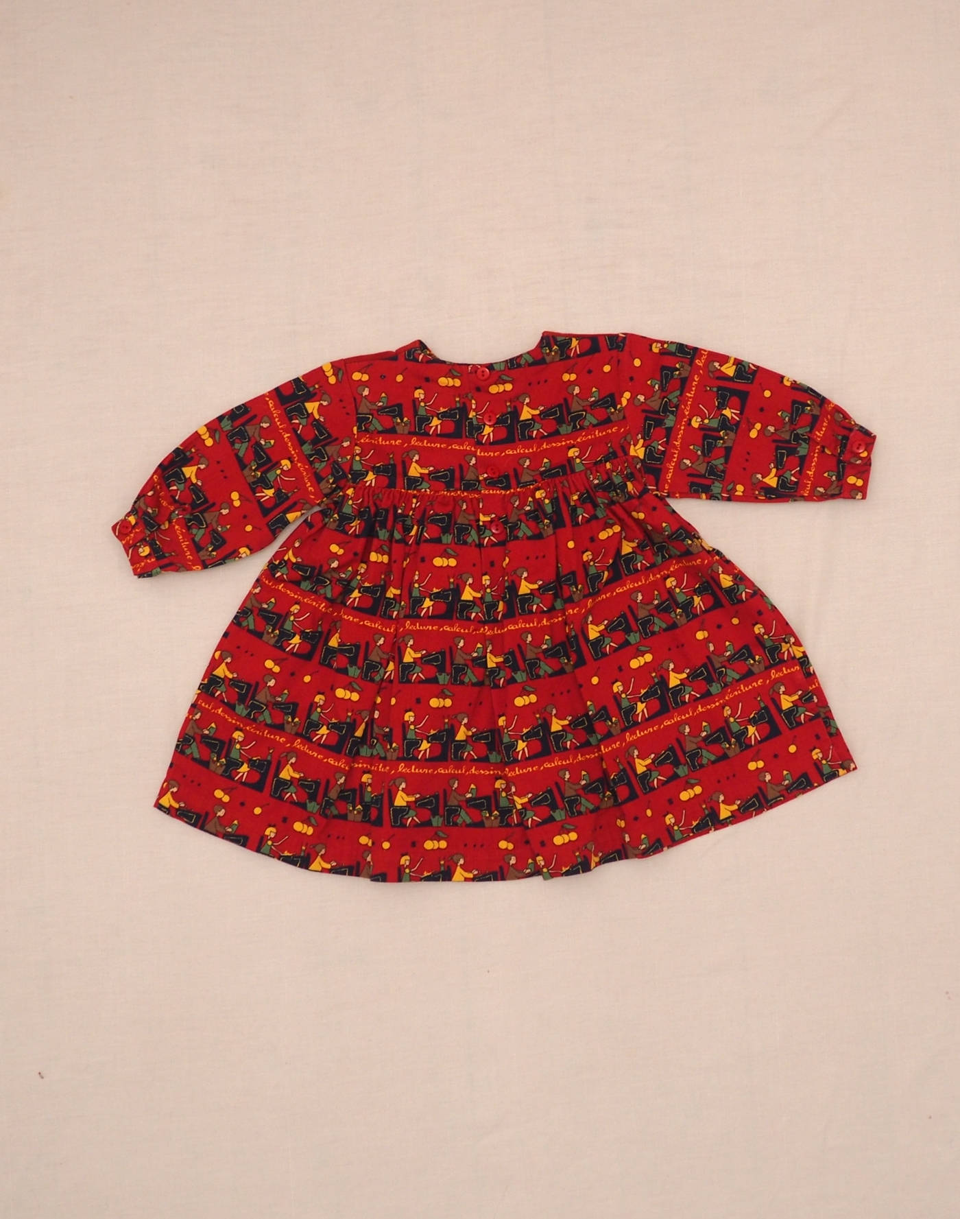 Adorable winter dress with schoolboy motif, contrasting bust in fine burgundy corduroy, long buttoned sleeves, pleated chest, two decorative buttons on front and five buttons on back. Very good condition, 100% cotton.