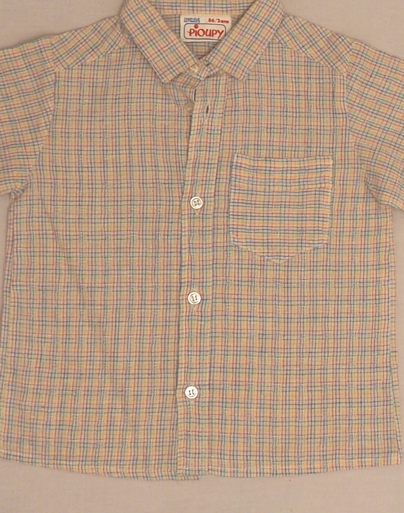 Cute seersucker blouse with multicolored checks, lapel on sleeve, one chest pocket, closed with five buttons. Made in France, very good condition, 82% cotton, 18% polyester fabric.