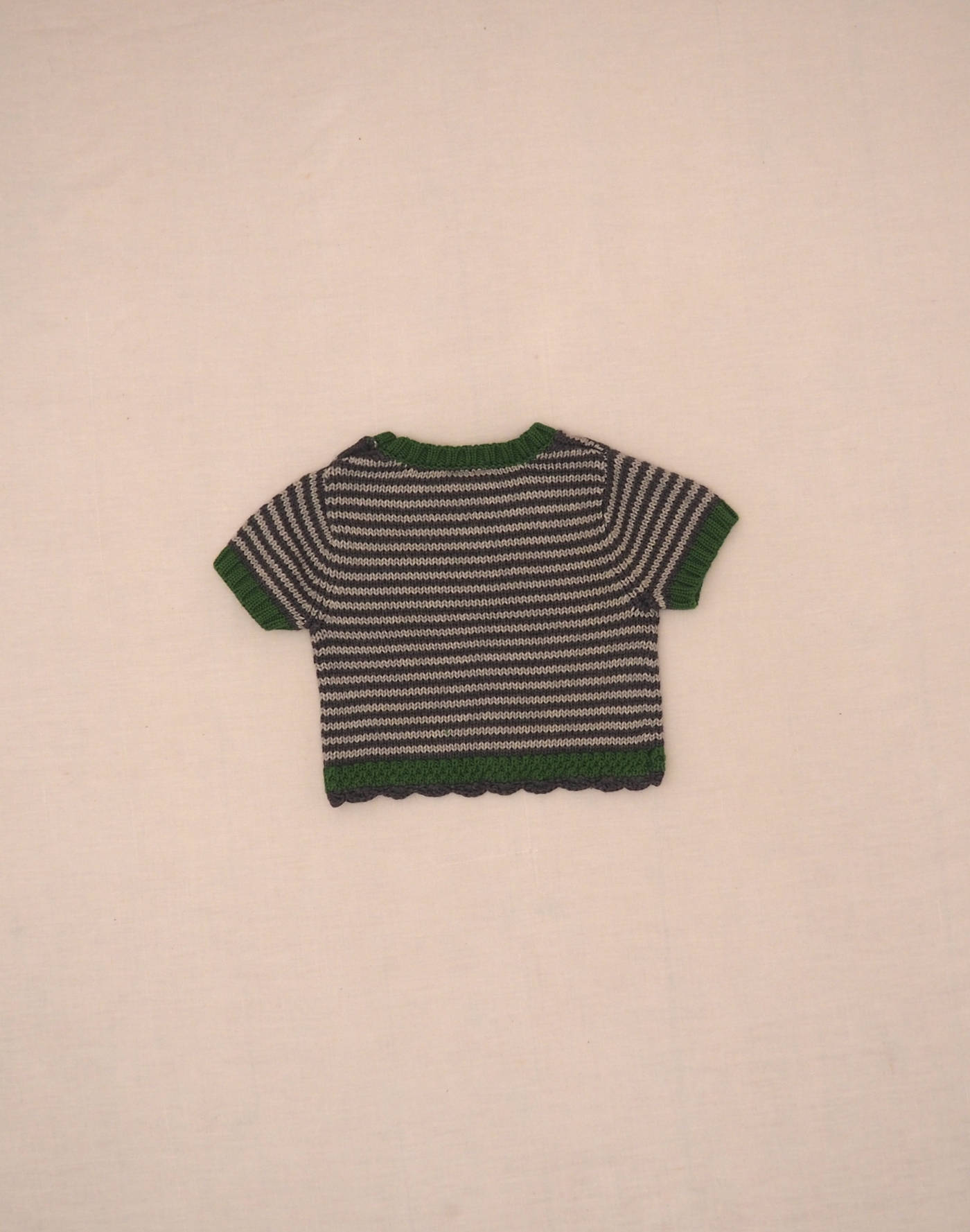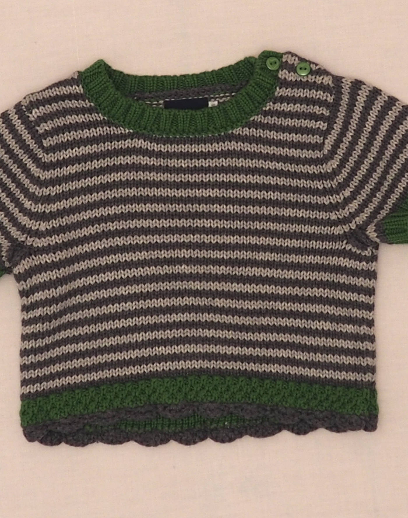 Cute short T-shirt in grey striped knit with collar and green sleeve edges and pretty crocheted finish on the waist. Closed at the shoulder with two buttons. Very good condition, 100% cotton.