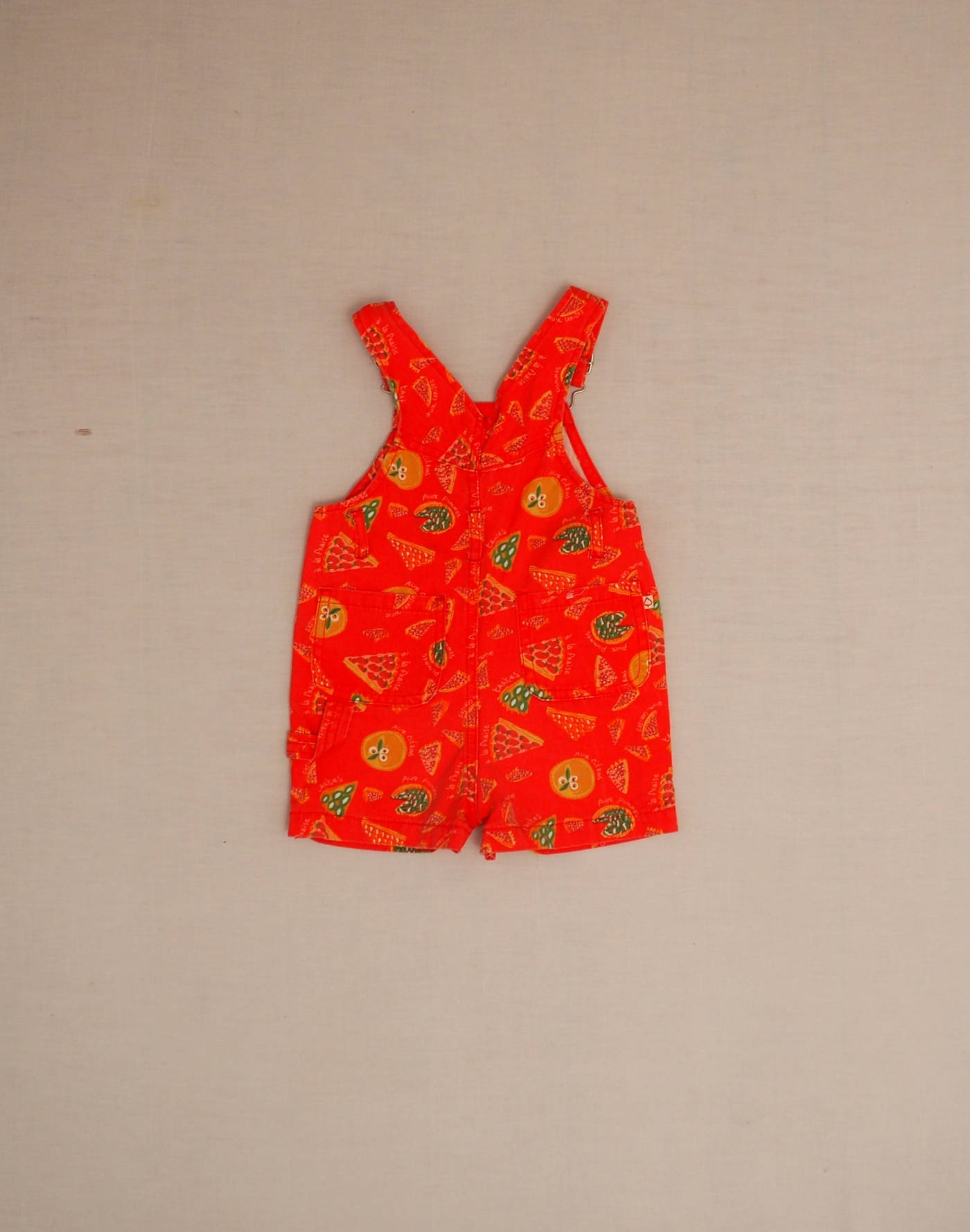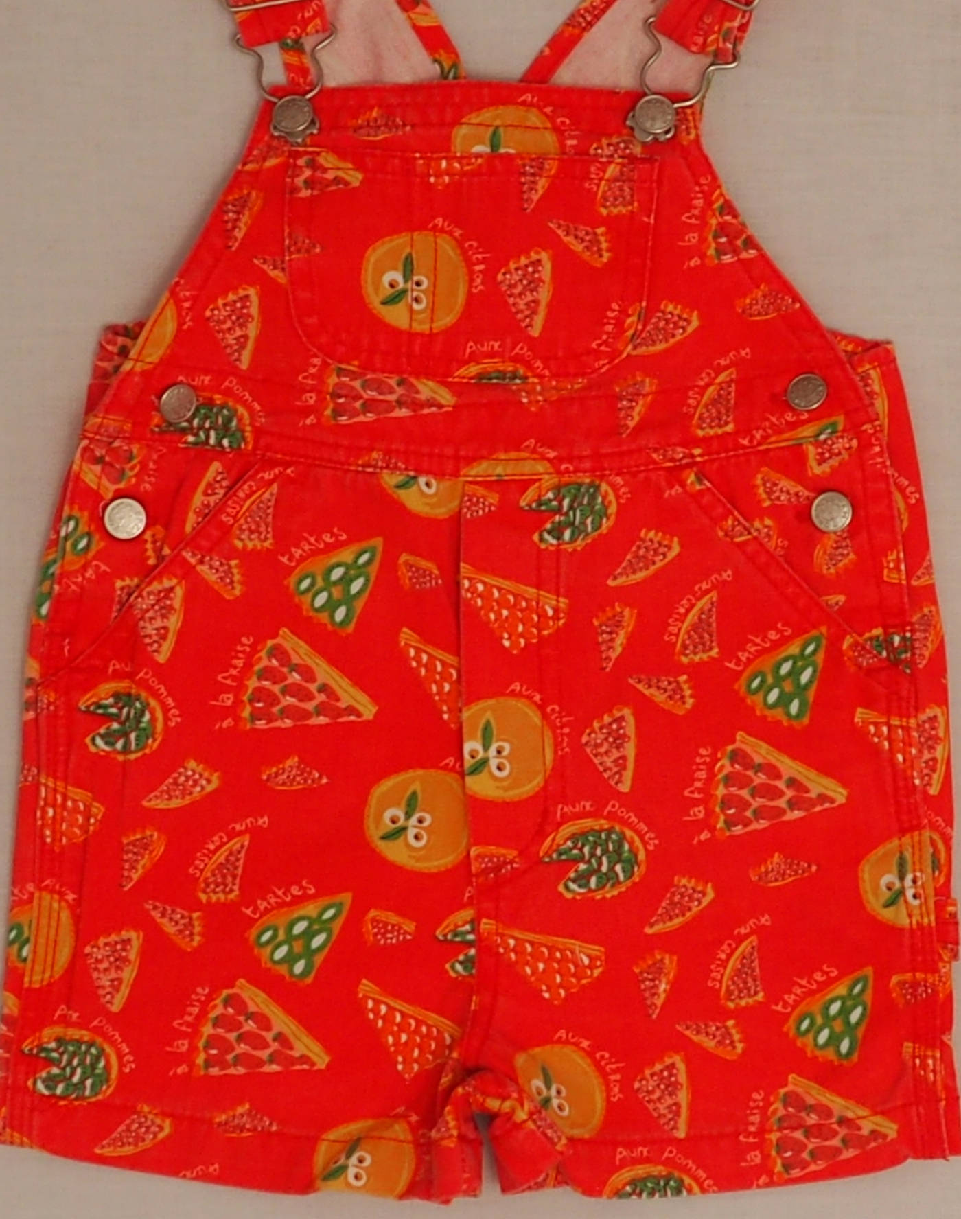 Cute dungarees in thick red cotton with pie pattern, one breast pocket and two front pockets, two patch pockets on back, adjustable straps fastened with two rivets on front, four rivets on waist. Very good condition, 100% cotton.