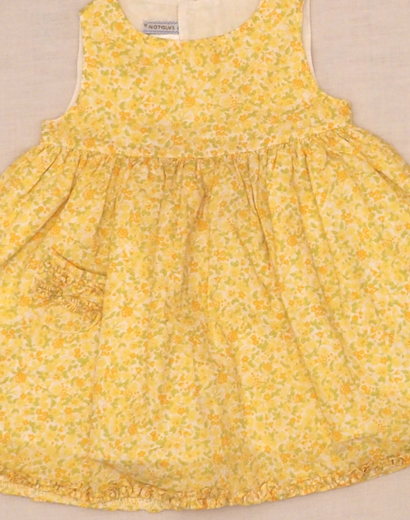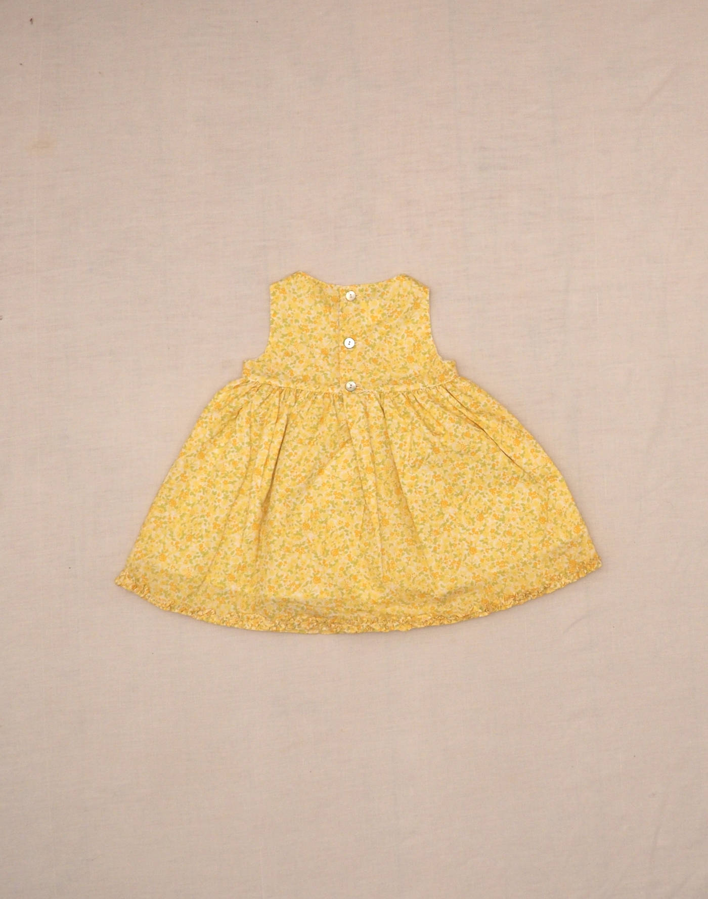 Natalys vintage. Beautiful sleeveless summer dress in fine cotton with small yellow flowers, fully lined in white cotton, pleated at the waist, one patch pocket in front, frills on the bottom of the dress. Closed in the back with three real mother-of-pearl buttons. Very good condition, 100% cotton.