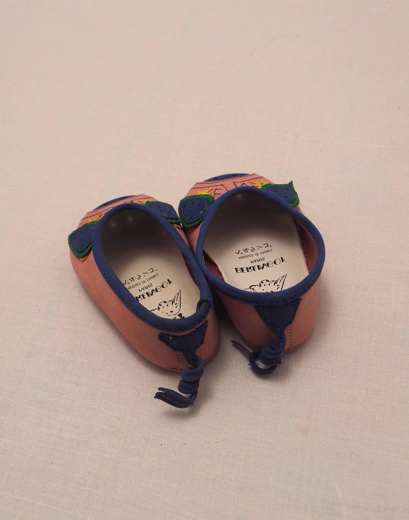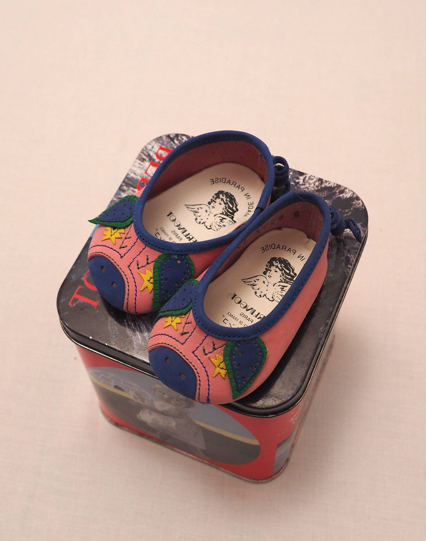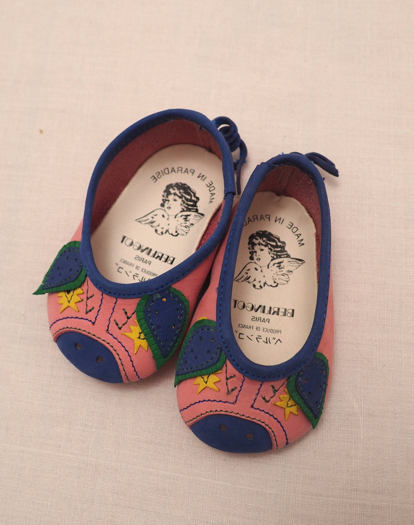 French size 16. By Berlingot, the iconic brand of “the most beautiful baby shoes in the world”, sent with the original metal box designed by Loulou Picasso. Magnificent pink booties with appliqué and “cochon” embroidery with a little pigtail behind. Brand new, made in France and “Made in Paradise”.