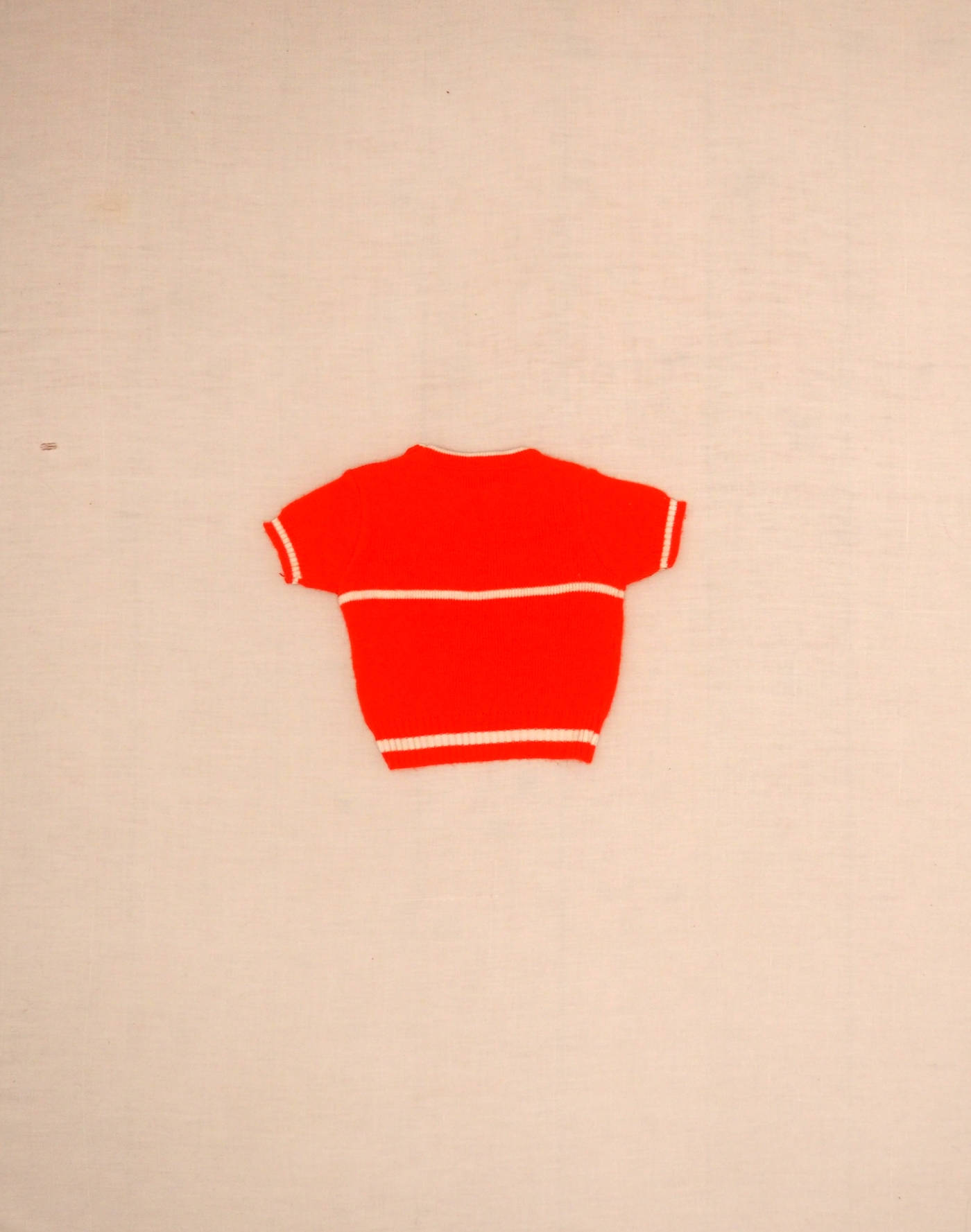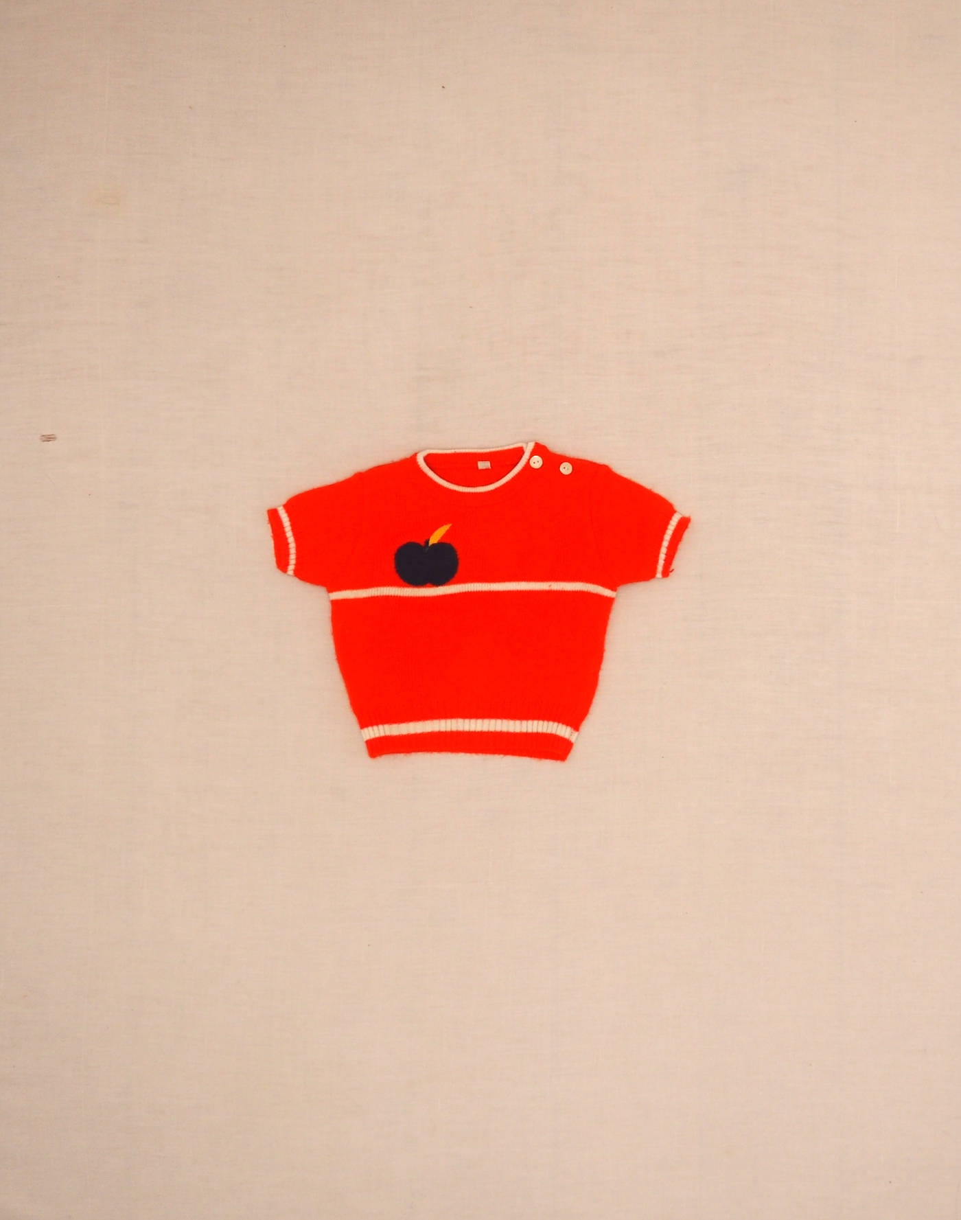 1970s. Cute orange knit T-shirt with white stripe on bust and sleeves, a little apple appliqué. Made in France, very good condition, acrylic knit.
