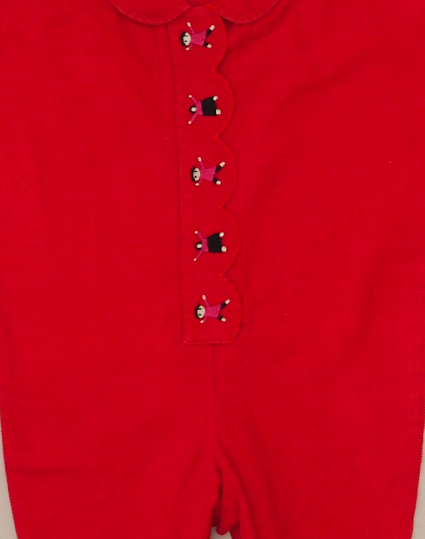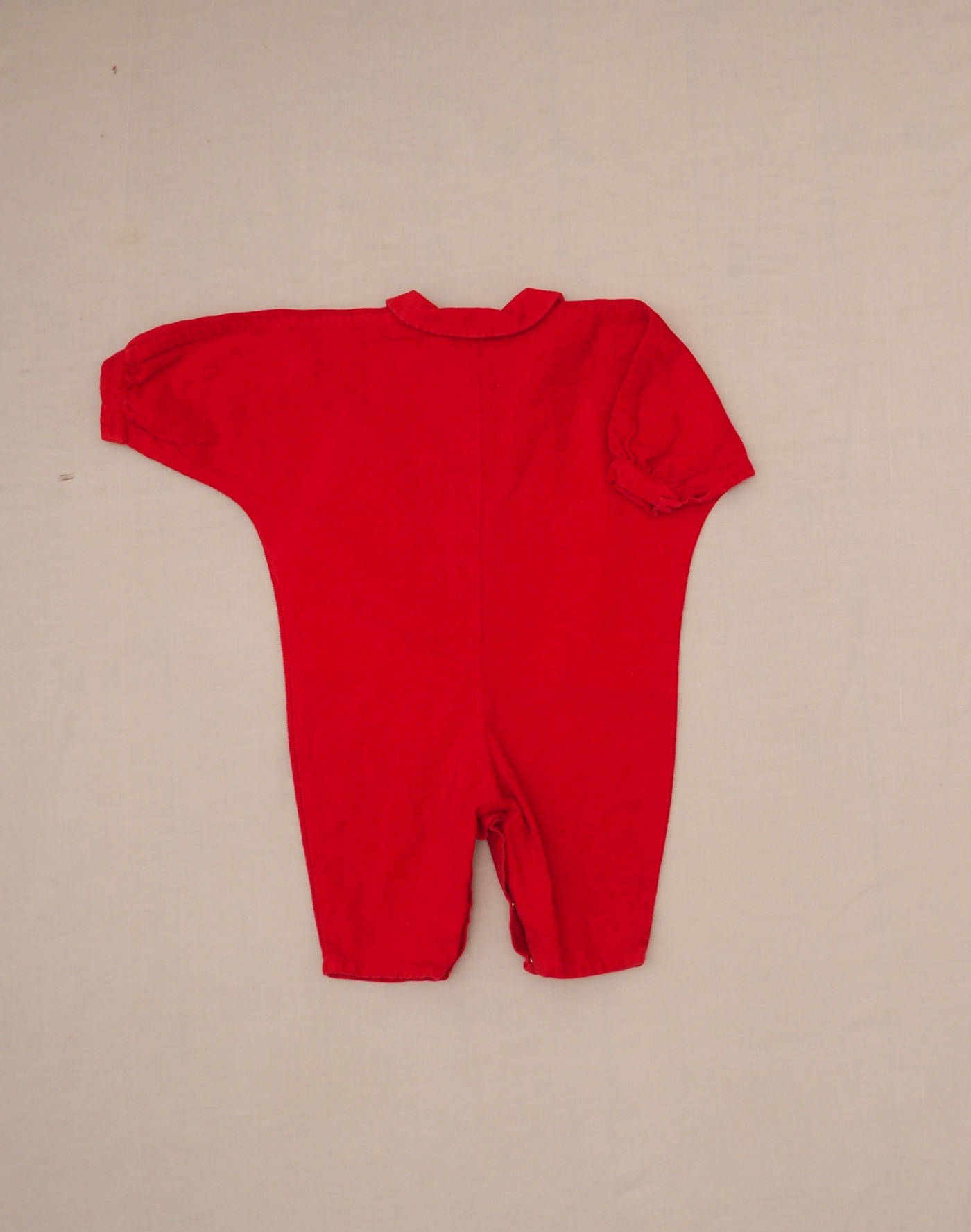 Magnificent red corduroy jumpsuit, long buttoned sleeves, buttonhole lapel embroidered with little men. Closed with five buttons at front, seven snaps at crotch. Made in France, very good condition, no composition label but cotton feel. Indicated for 6 months but oversized, corresponds to a standard 9 months.