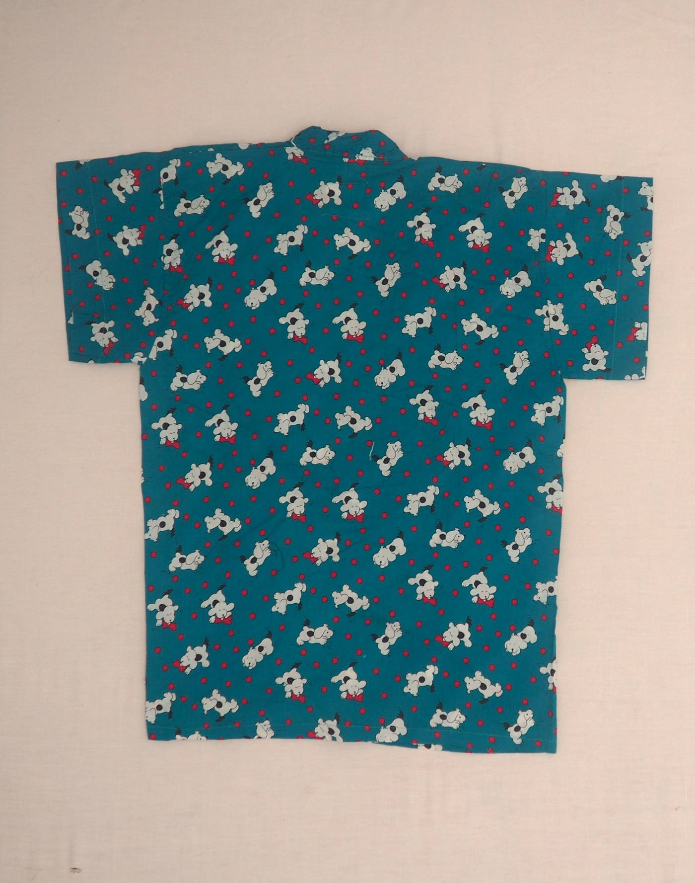 Cute green bathrobe with a pattern strongly resembling Spot the dog, and small fuschia polka dots. Two pockets. Very good condition, 100% cotton.