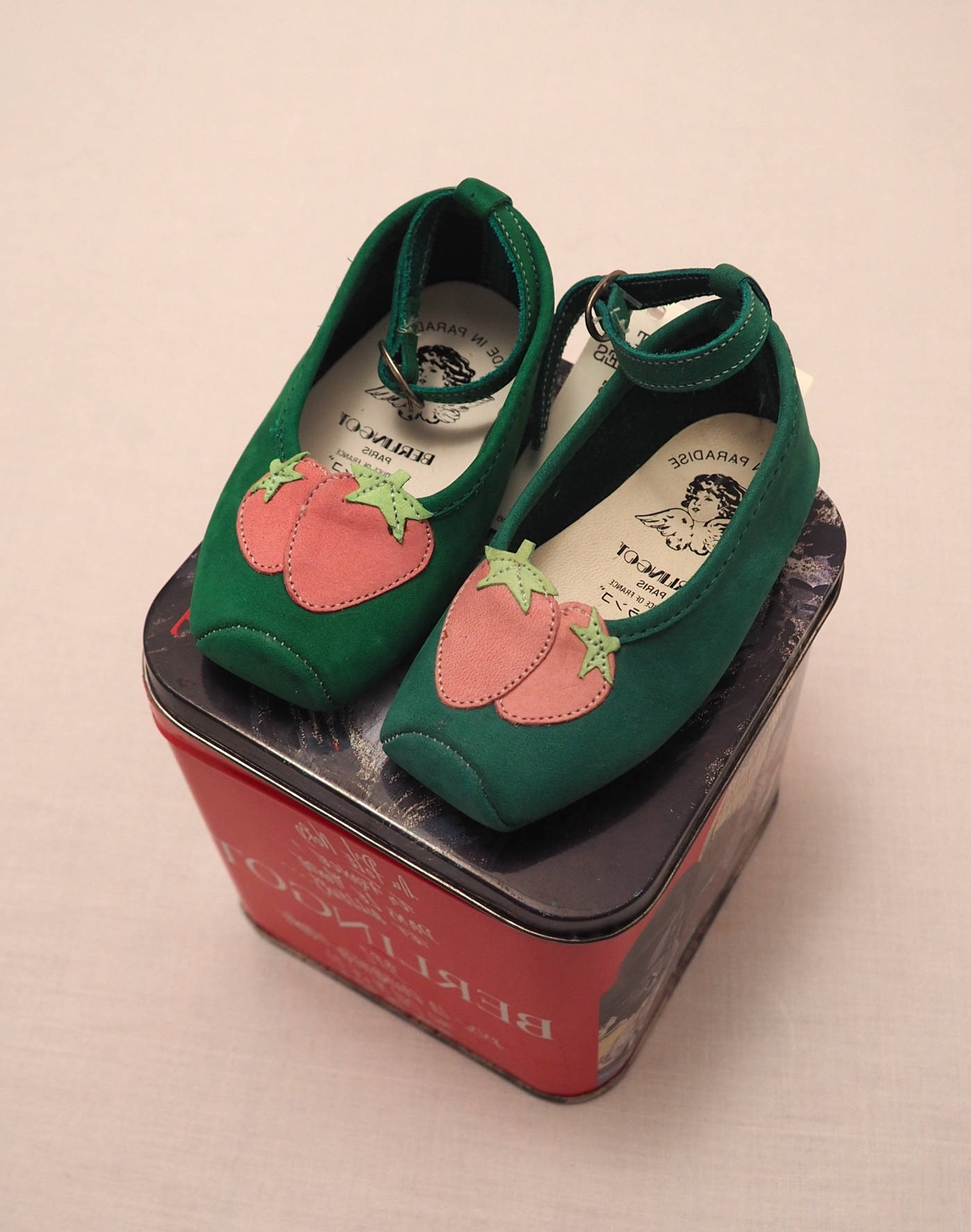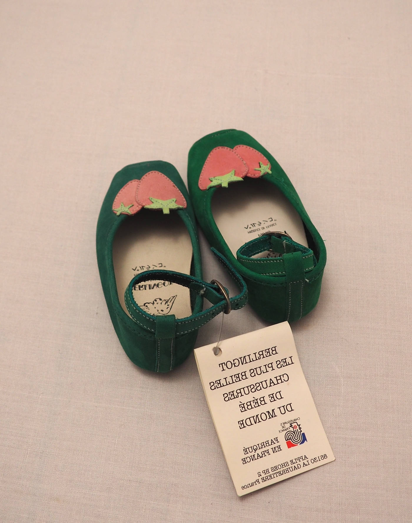 French size 18. By Berlingot, the iconic brand of “the most beautiful baby shoes in the world”, sent with the original metal box designed by Loulou Picasso. Magnificent green nubuck booties with strawberry appliqué, little strap to fasten. Brand new, made in France and “Made in Paradise”.