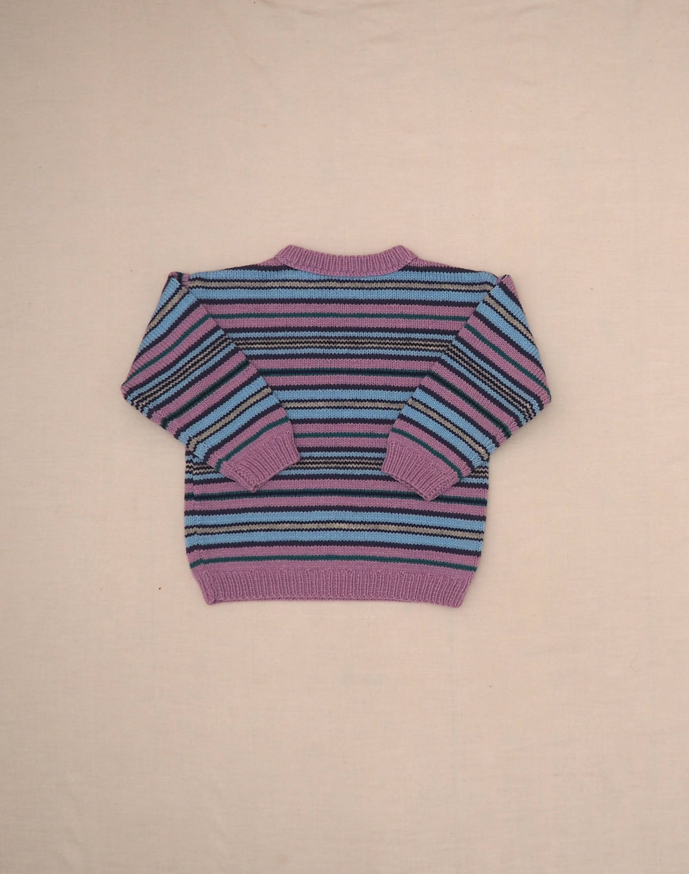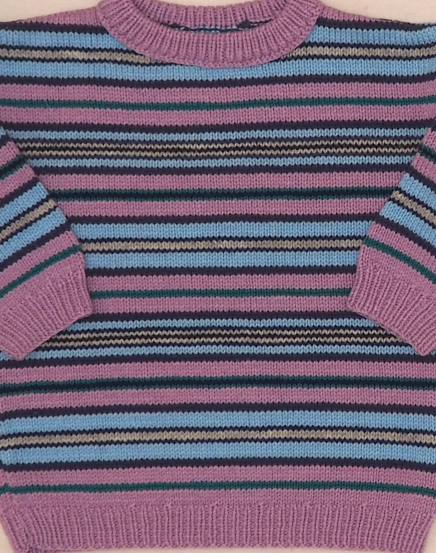 Hand-knitted piece. Beautiful sweater with multicolored stripes in violet tones. Very good condition, soft wool-blend feel.
