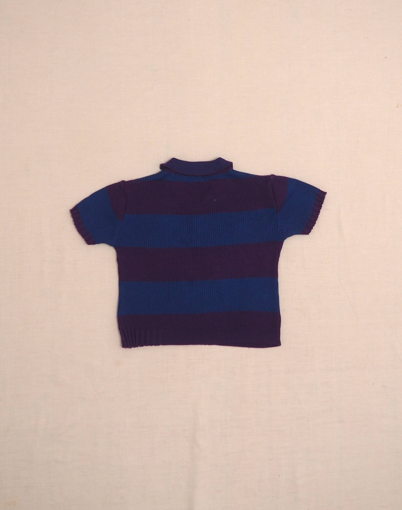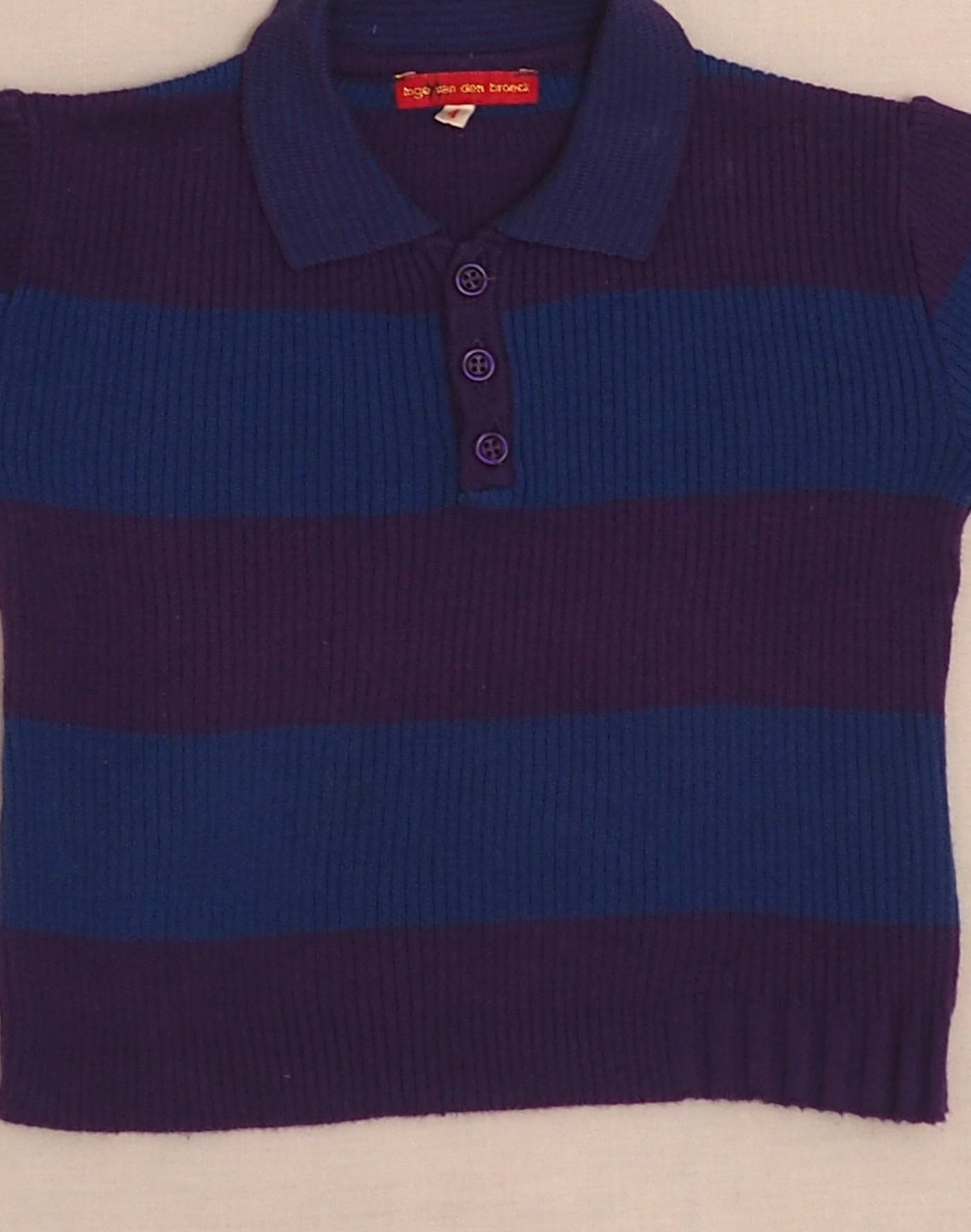 Pretty polo shirt in ribbed knit with large purple and blue stripes. Short sleeves, striped collar fastened with three buttons. Very good condition, 100% cotton.