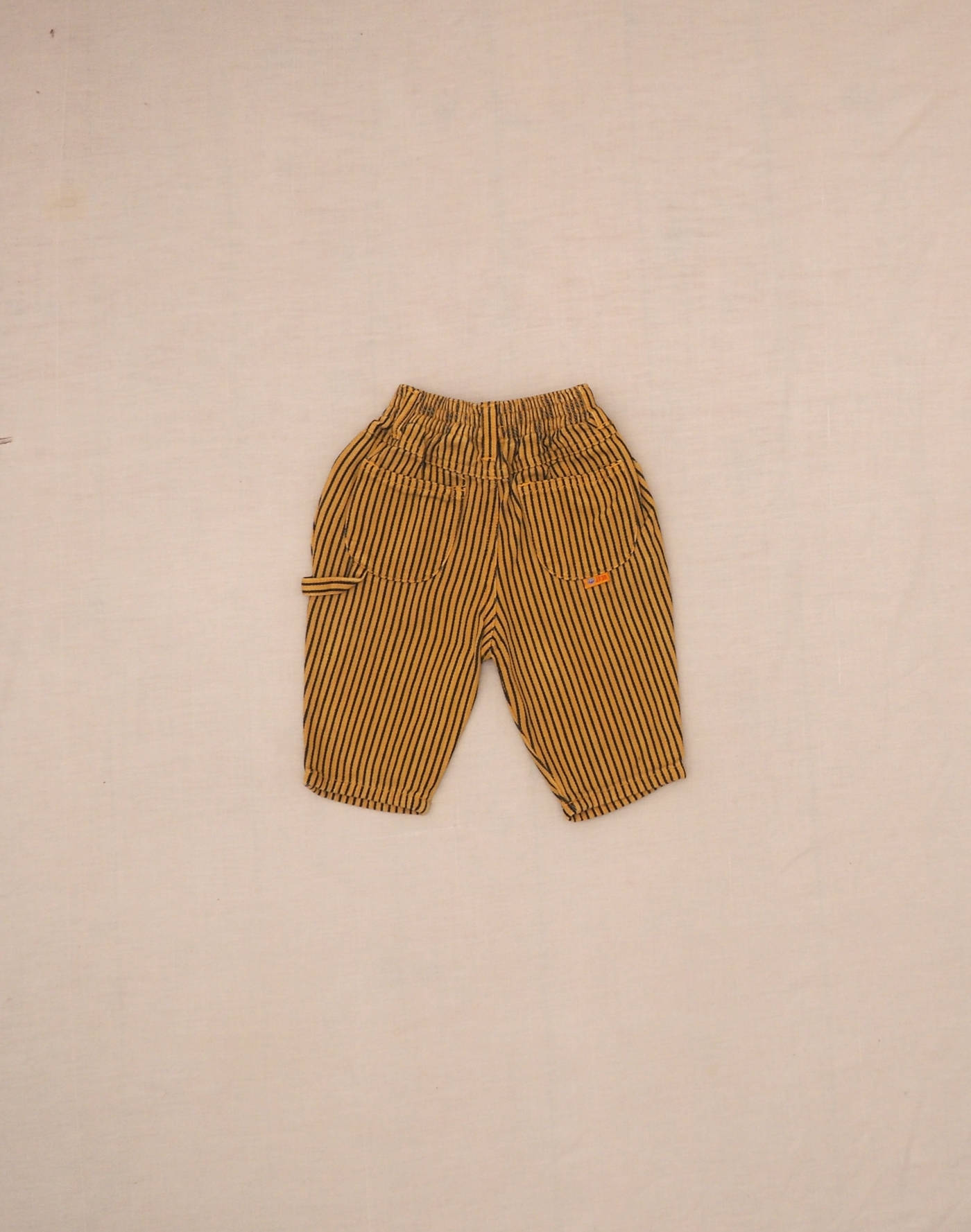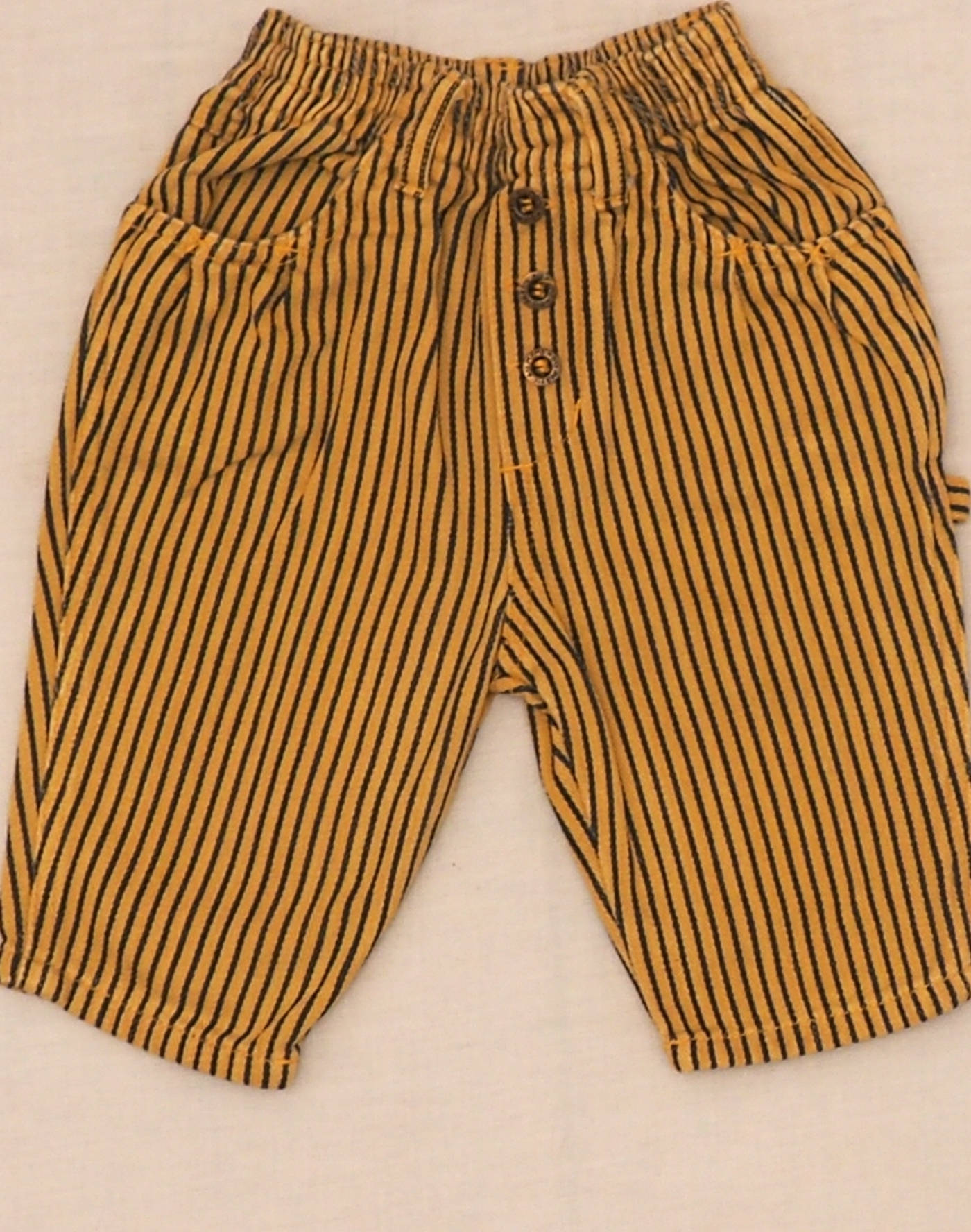 Cute pants with yellow and gray stripes, elastic waistband, two front pockets, two patch pockets in back, three decorative buttons. Very good condition, 100% cotton.