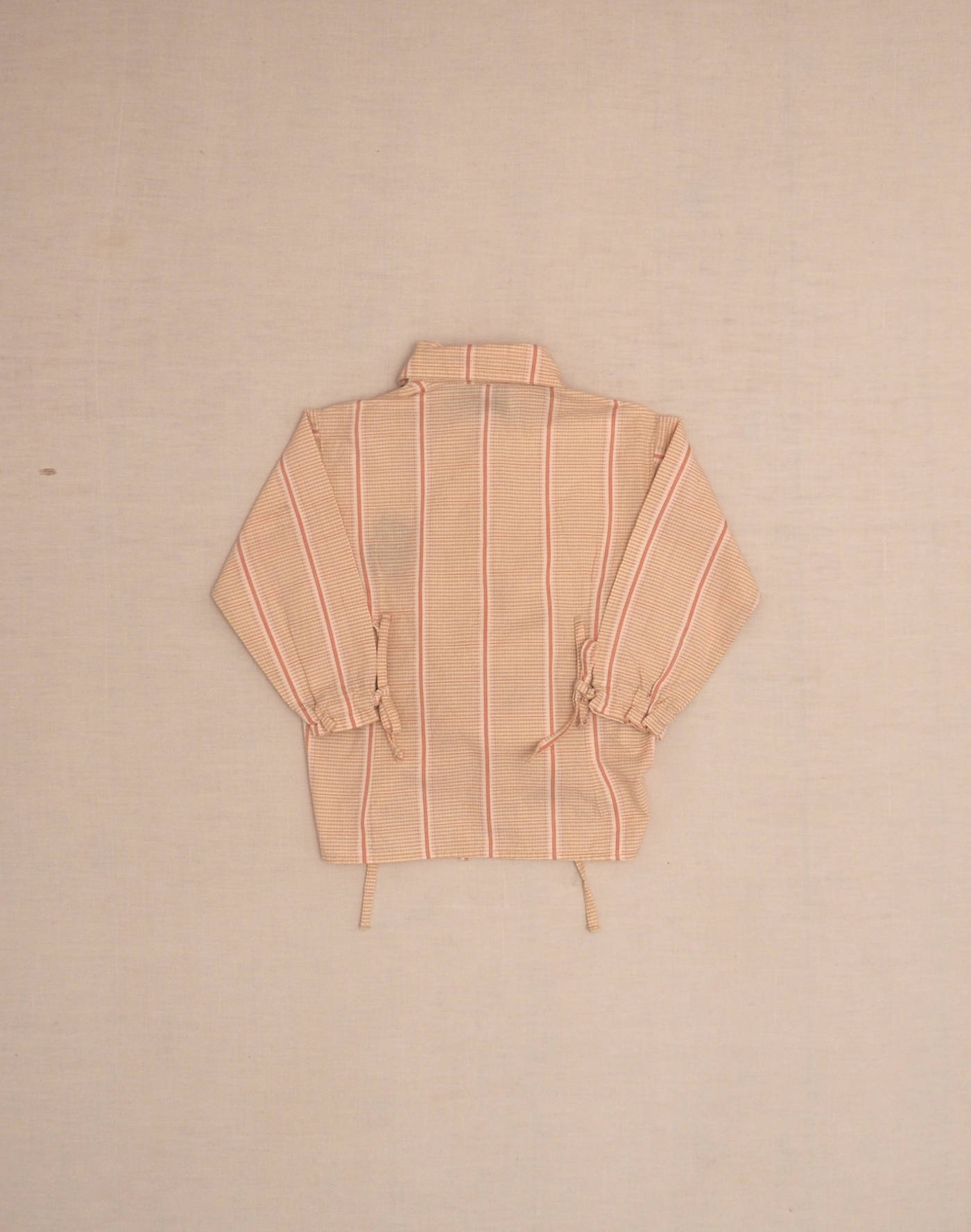 Cute blouse with pink and green checks and stripes, long sleeves with bows at wrists, two gathers to tie at waist, closed with six flower-shaped buttons. Very good condition, 100% cotton.