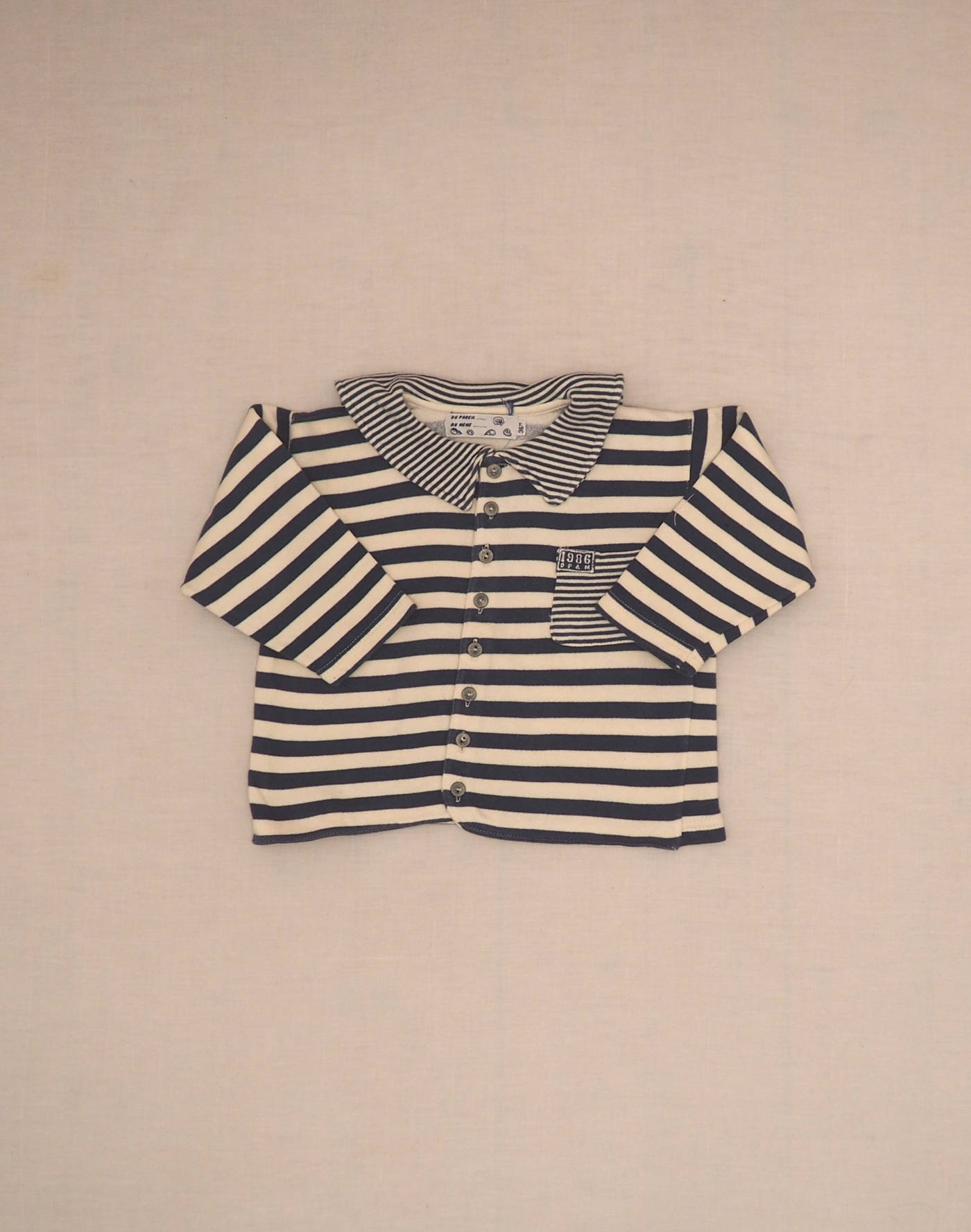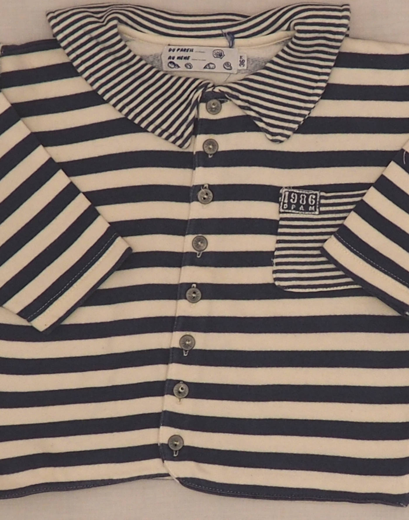 Attractive shirt in white and blue striped jersey, sailor collar and patch pocket with fine stripes. Closed with eight buttons. Very good condition, jersey 50% cotton, 50% acrylic.