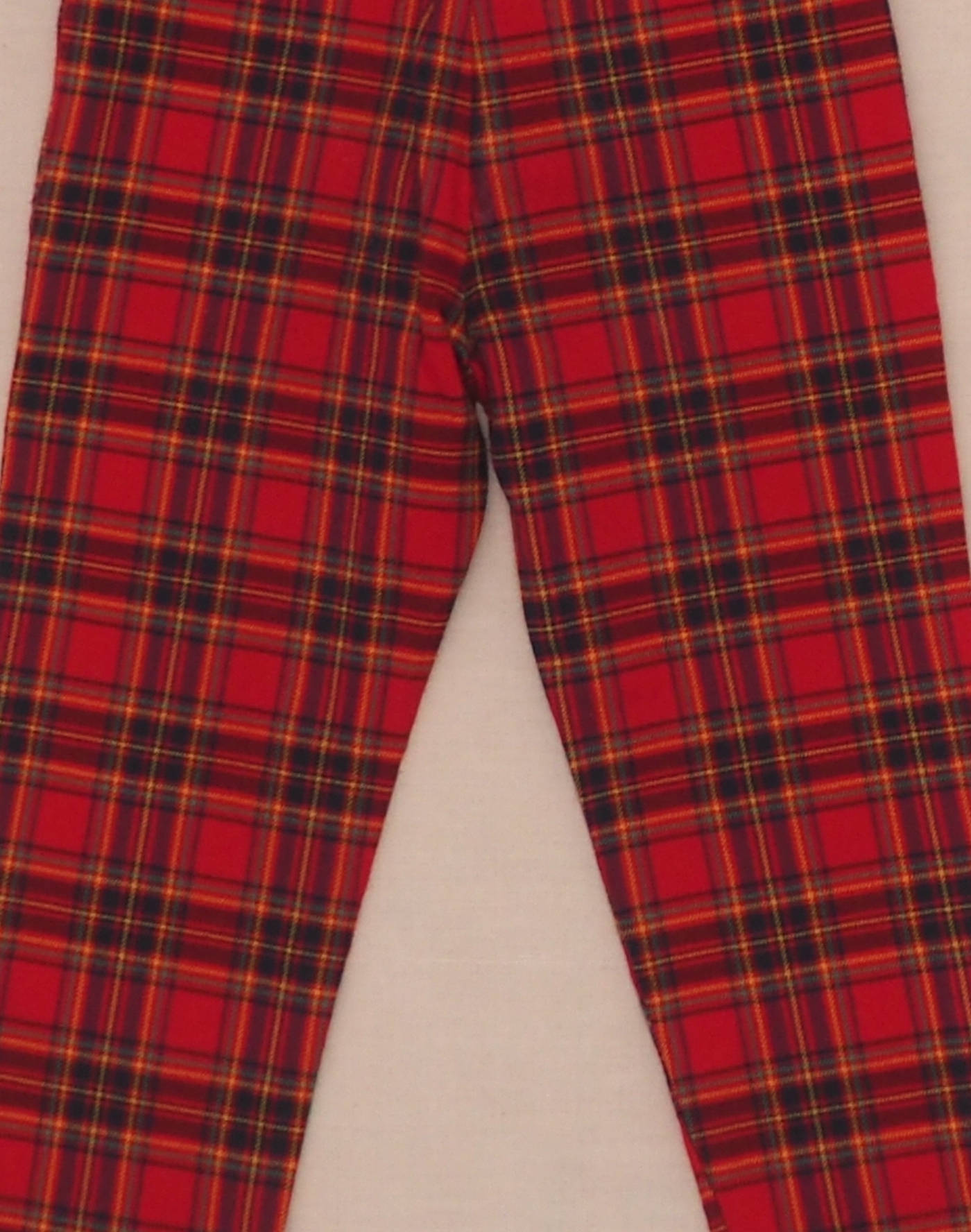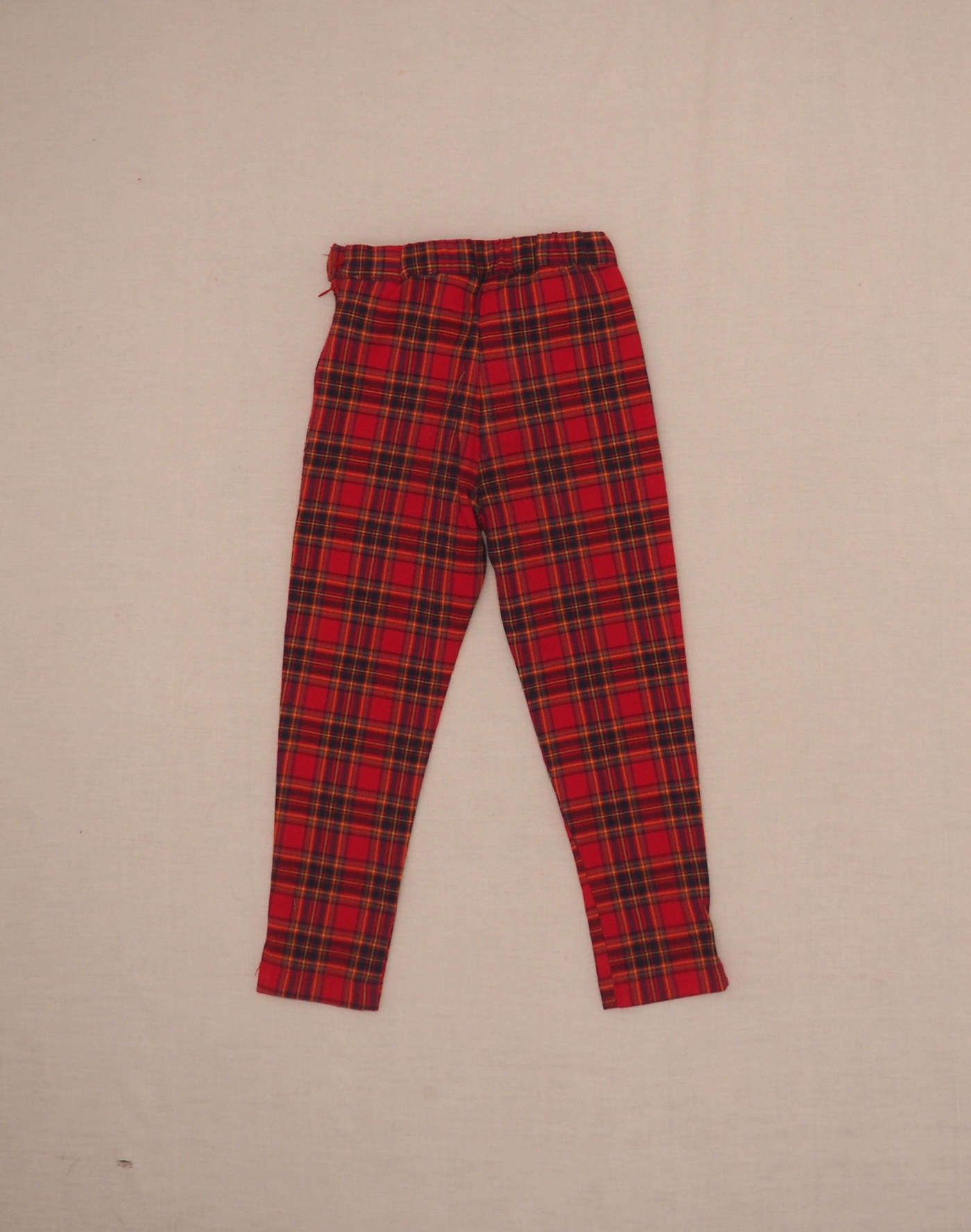 Size 6 years. Between pants and leggings, red tartan-print spindles, two false buttoned waist pockets, side button closure and zipper. Very good condition, fabric 44% cotton, 35% polyester, 18% viscose.