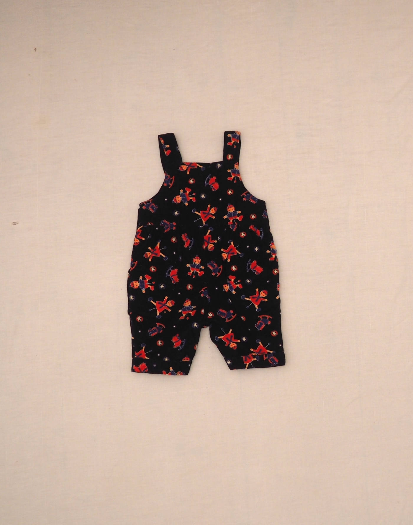 Lovely dungarees in finely ribbed navy blue velvet with toy print. One small pocket on the bust, adjustable straps on two buttoned front levels, two front pockets, five snap buttons on the crotch. Very good condition, 100% cotton.