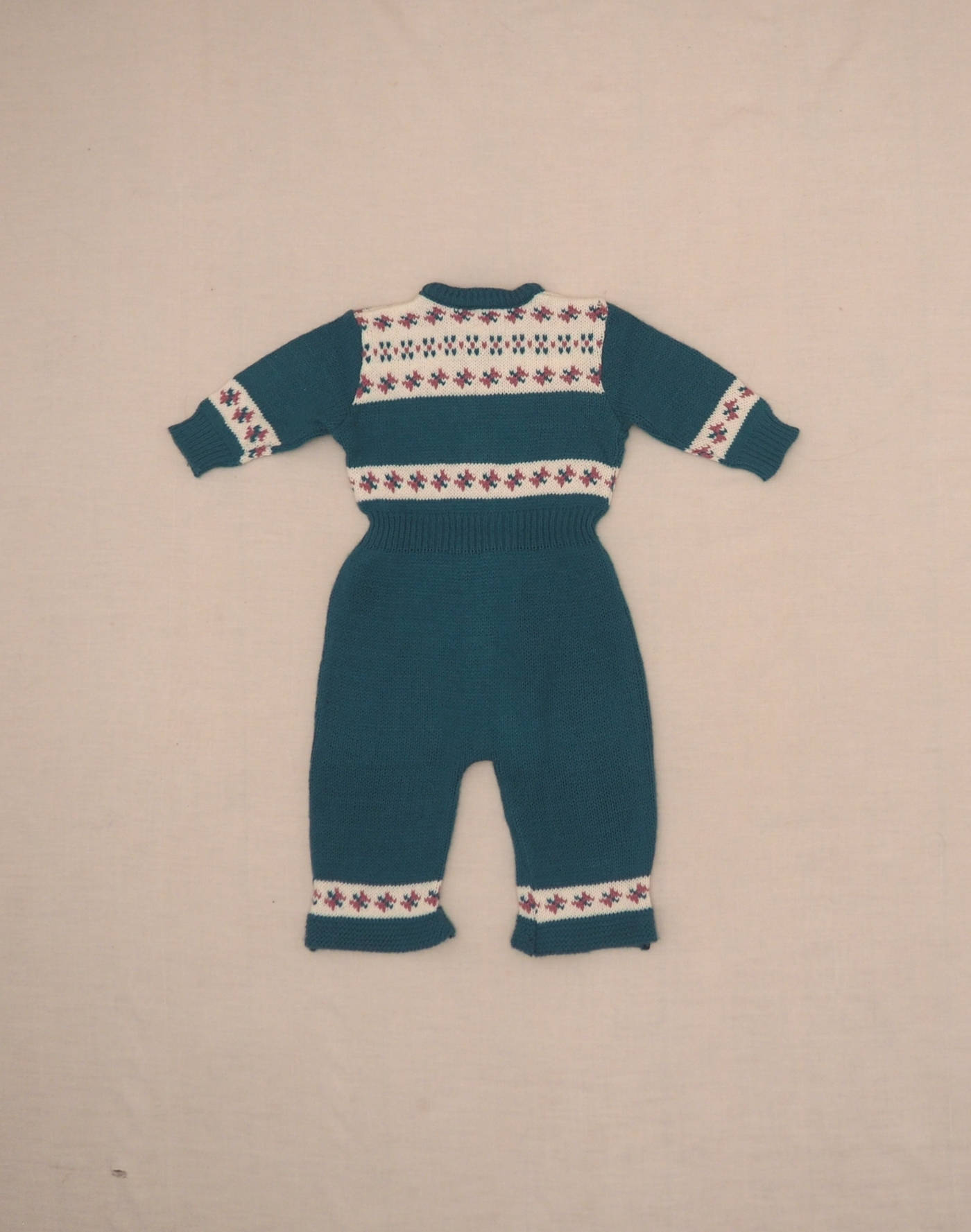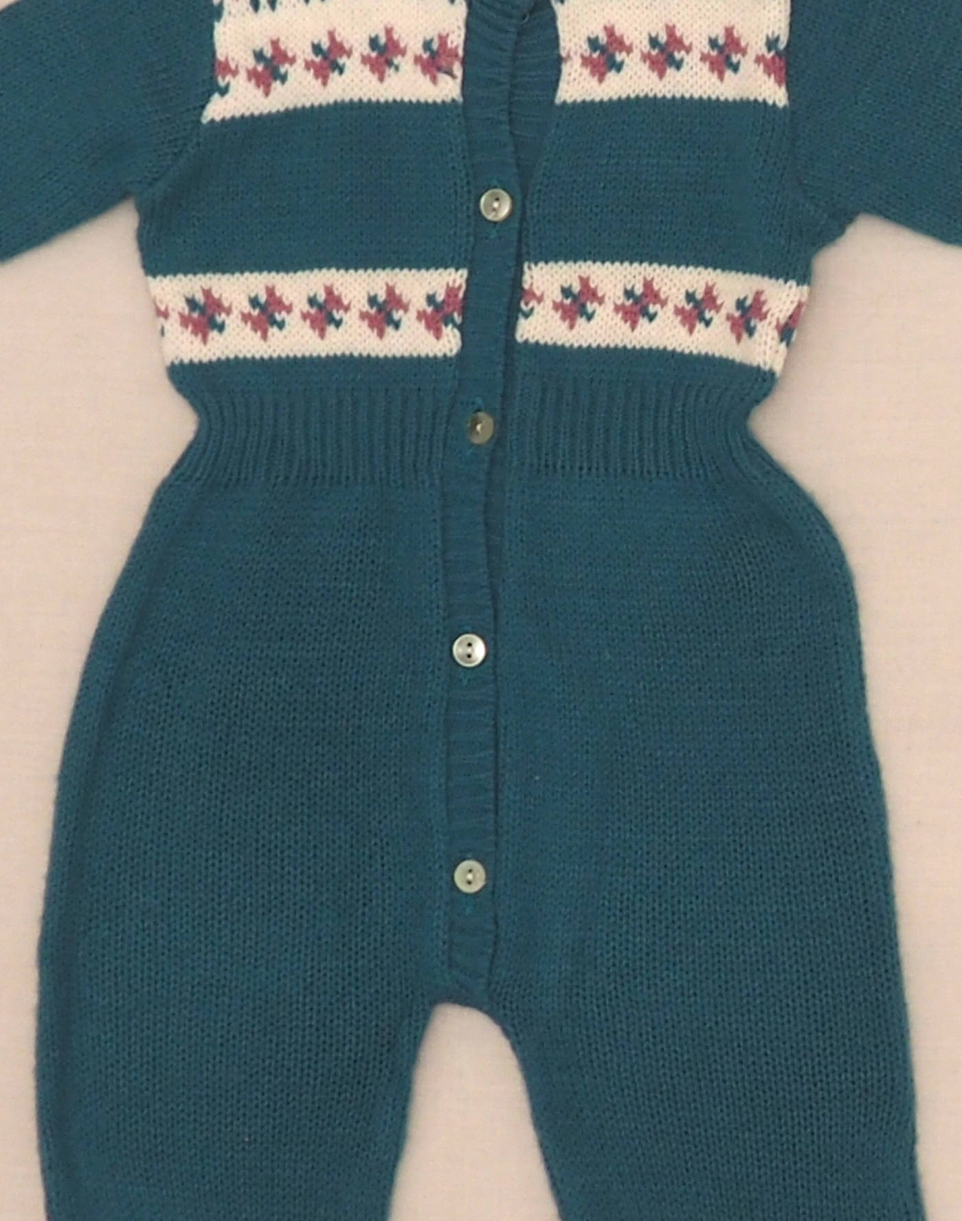 Perfectly 1970s, turquoise long-sleeved knit jumpsuit with eph leg and white and pink jacquard pattern. Closed with five buttons. Made in France, very good condition, acrylic knit.