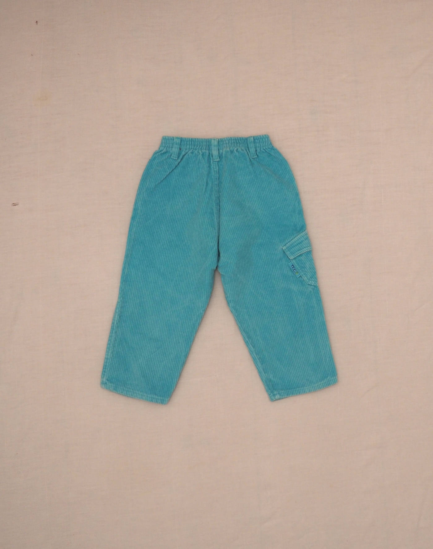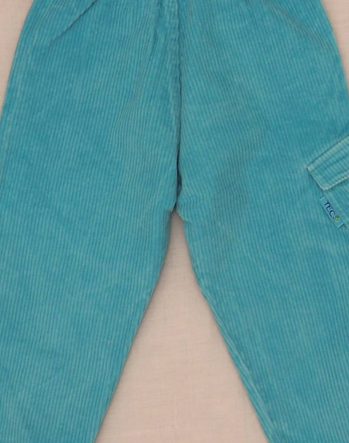 Perfect for winter, turquoise blue corduroy pants, two front pockets, one buttoned leg pocket. Elastic waistband, front patch. Very good condition, 100% cotton, made in Spain.
