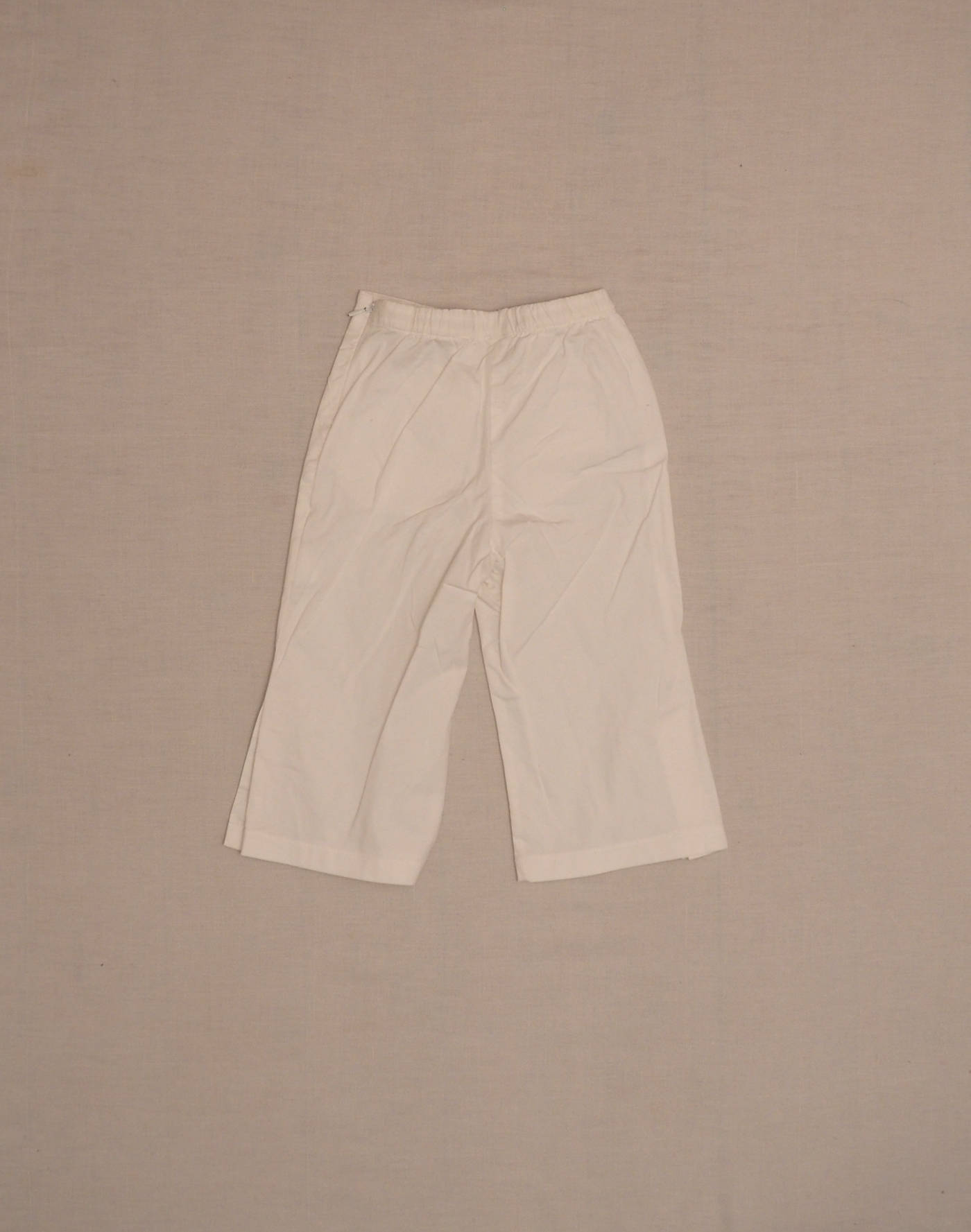 Perfect summer breeches in white cotton, elastic waistband with two decorative buttons and two front pockets, flared leg. Invisible side zipper. Very good condition, fabric 96% cotton, 4% elastane.